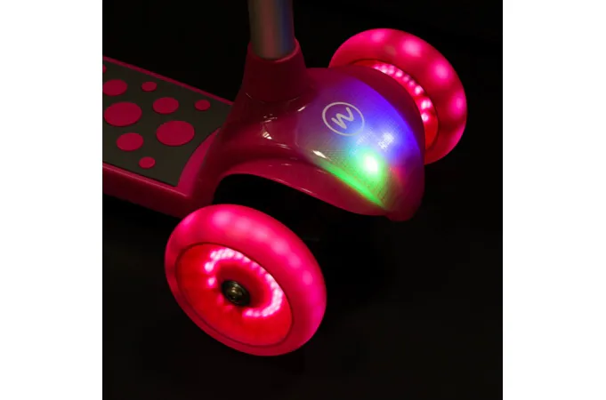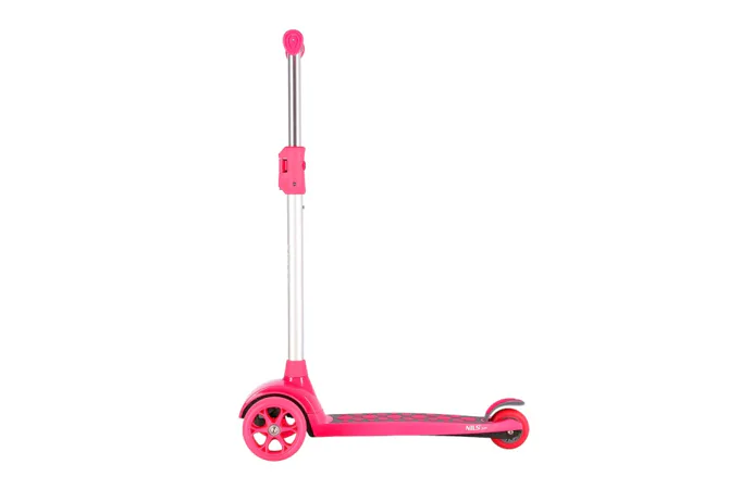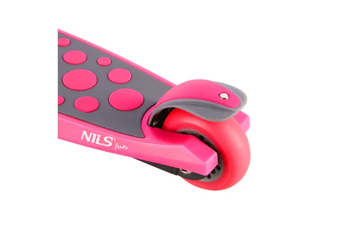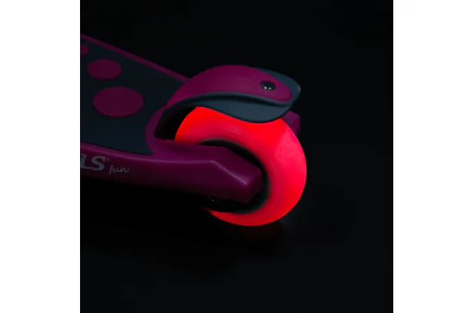 Koloběžka NILS Fun HLB02 má kolečka osazena svítícími LED diodami, které slouží jako zajímavý, vizuální prvek, zvyšují zájem dětí a v neposlední řadě zvyšují viditelnost koloběžky například za šera. Kolečka svítí automaticky během jejich otáčení.