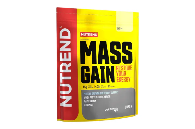MASS GAIN příchuť vanilka: 63 % syrovátkový proteinový koncentrát, maltodextrin, glukóza, fruktóza, 4 % isomaltulóza - Palatinose TM (je zdrojem fruktózy a glukózy), bezlepková pšeničná vláknina, L-glutamin, aroma, L-leucin, stabilizátory akáciová a xanthanová guma, L-arginin-alfa-ketoglutarát, L-isoleucin, L-valin, taurin, protispékavé látky fosforečnan vápenatý a oxid křemičitý, vitaminový premix (kyselina L-askorbová, DL-α-tokoferylacetát, nikotinamid, D-pantotenát vápenatý, pyridoxin hydrochlorid, riboflavin, thiamin mononitrát, kyselina pteroylmonoglutamová, D-biotin, kyanokobalamin), sladidla sukralóza a steviol-glykosidy, barvivo beta-karoten. Výrobek může obsahovat stopy sóji.