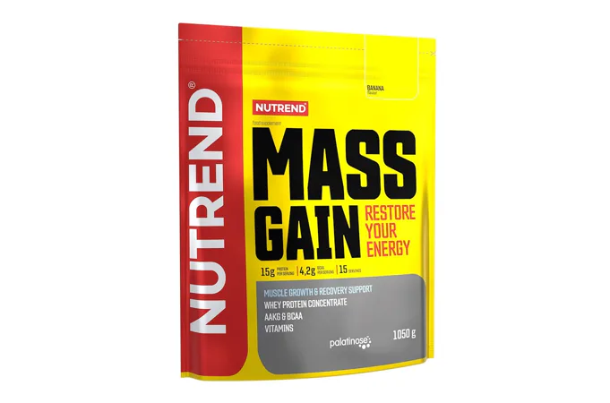 MASS GAIN příchuť banán: 63 % syrovátkový proteinový koncentrát, maltodextrin, glukóza, fruktóza, 4 % isomaltulóza - Palatinose TM (je zdrojem fruktózy a glukózy), bezlepková pšeničná vláknina, L-glutamin, L-leucin, stabilizátory akáciová a xanthanová guma, aroma, L-arginin-alfa-ketoglutarát, L-isoleucin, L-valin, taurin, protispékavé látky fosforečnan vápenatý a oxid křemičitý, vitaminový premix (kyselina L-askorbová, DL-α-tokoferylacetát, nikotinamid, D-pantotenát vápenatý, pyridoxin hydrochlorid, riboflavin, thiamin mononitrát, kyselina pteroylmonoglutamová, D-biotin, kyanokobalamin), sladidla sukralóza a steviol-glykosidy, barvivo beta-karoten. Výrobek může obsahovat stopy sóji.