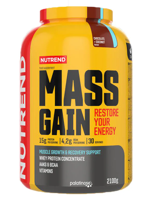 MASS GAIN příchuť čokoláda + kokos: syrovátkový proteinový koncentrát, glukóza, kakao, fruktóza, Palatinose TM – isomaltulóza (je zdrojem fruktózy a glukózy),maltodextrin, L-glutamin, L-leucin, aroma, L-arginin-alfa -ketoglutarát, L-isoleucin, L-valin, taurin, zahušťovadlo xanthanová guma, protispékavé látky fosforečnan vápenatý a oxid křemičitý, multivitaminový premix (vitaminy: E, B1, B6, B2, B12, B3, B5, H, C a kyselina listová), sladidla sukralóza a acesulfam K. Výrobek obsahuje alergen laktózu.