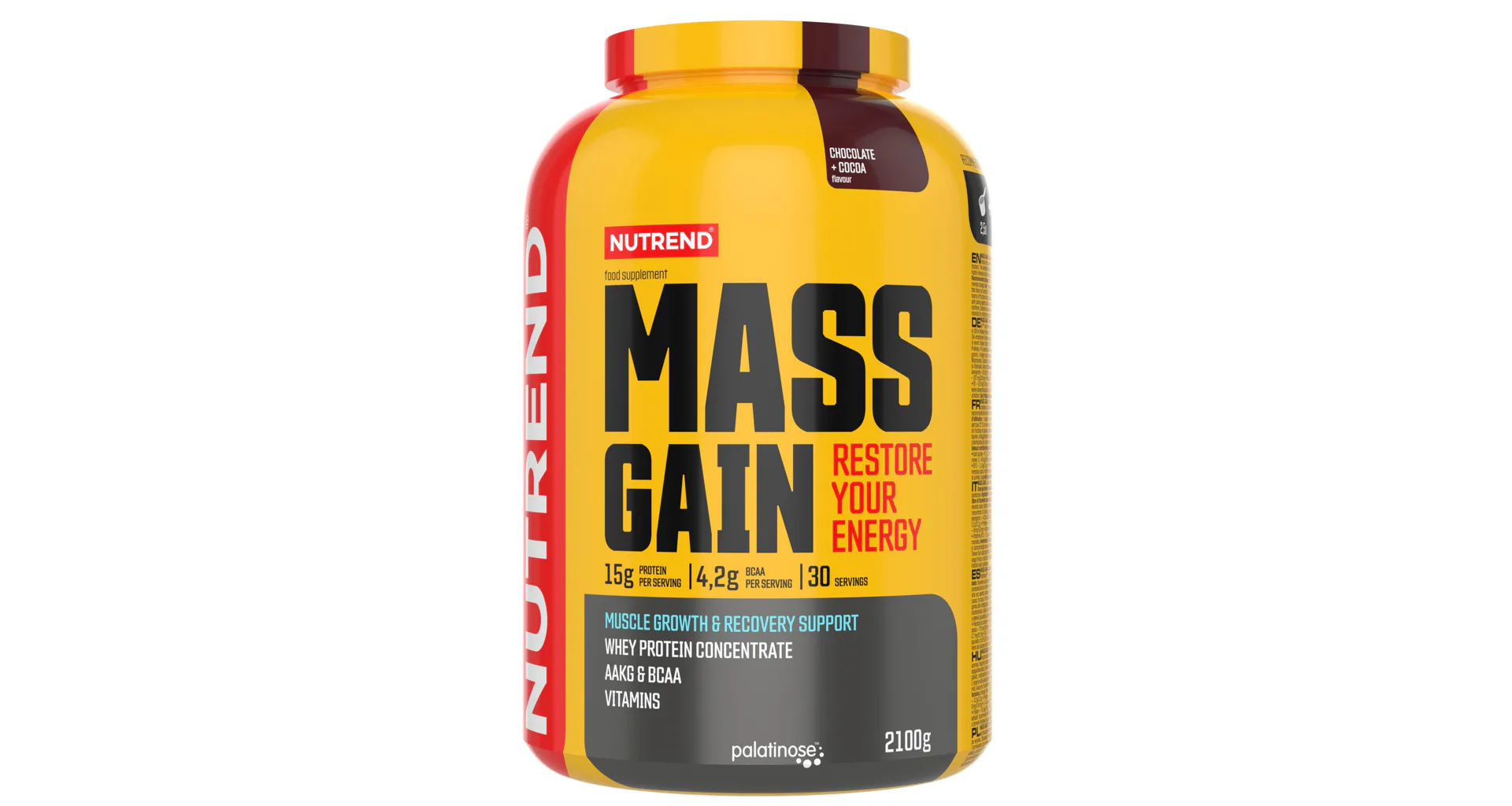 MASS GAIN příchuť čokoláda + kakao: 61 % syrovátkový proteinový koncentrát, glukóza, maltodextrin, kakao, fruktóza, 4 % isomaltulóza - Palatinose TM (je zdrojem fruktózy a glukózy), bezlepková pšeničná vláknina, L-glutamin, L-leucin, stabilizátory akáciová a xanthanová guma, L-arginin-alfa-ketoglutarát, L-isoleucin, L-valin, taurin, protispékavé látky fosforečnan vápenatý a oxid křemičitý, vitaminový premix (kyselina L-askorbová, DL-α-tokoferylacetát, nikotinamid, D-pantotenát vápenatý, pyridoxin hydrochlorid, riboflavin, thiamin mononitrát, kyselina pteroylmonoglutamová, D-biotin, kyanokobalamin), sladidla sukralóza a steviol-glykosidy, aroma.