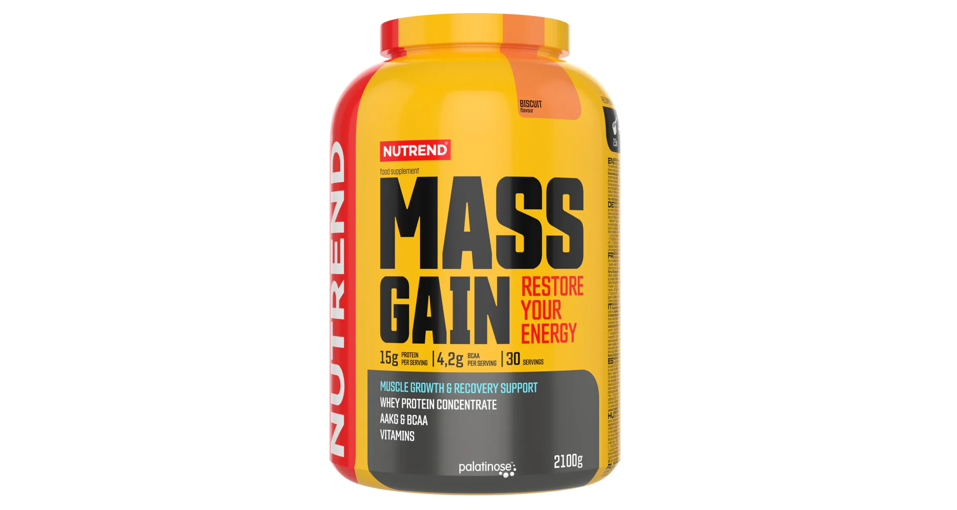 MASS GAIN příchuť biscuit: 63 % syrovátkový proteinový koncentrát, maltodextrin, glukóza, fruktóza, 4 % isomaltulóza - Palatinose TM (je zdrojem fruktózy a glukózy), bezlepková pšeničná vláknina, L-glutamin, L-leucin, stabilizátory akáciová a xanthanová guma, aroma, L-arginin-alfa-ketoglutarát, L-isoleucin, L-valin, taurin, protispékavé látky fosforečnan vápenatý a oxid křemičitý, vitaminový premix (kyselina L-askorbová, DL-α-tokoferylacetát, nikotinamid, D-pantotenát vápenatý, pyridoxin hydrochlorid, riboflavin, thiamin mononitrát, kyselina pteroylmonoglutamová, D-biotin, kyanokobalamin), barvivo E 150c, sladidla sukralóza a steviol-glykosidy, barvivo beta-karoten. Výrobek může obsahovat stopy sóji.