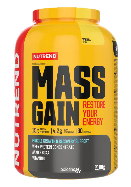 MASS GAIN příchuť vanilka: 63 % syrovátkový proteinový koncentrát, maltodextrin, glukóza, fruktóza, 4 % isomaltulóza - Palatinose TM (je zdrojem fruktózy a glukózy), bezlepková pšeničná vláknina, L-glutamin, aroma, L-leucin, stabilizátory akáciová a xanthanová guma, L-arginin-alfa-ketoglutarát, L-isoleucin, L-valin, taurin, protispékavé látky fosforečnan vápenatý a oxid křemičitý, vitaminový premix (kyselina L-askorbová, DL-α-tokoferylacetát, nikotinamid, D-pantotenát vápenatý, pyridoxin hydrochlorid, riboflavin, thiamin mononitrát, kyselina pteroylmonoglutamová, D-biotin, kyanokobalamin), sladidla sukralóza a steviol-glykosidy, barvivo beta-karoten. Výrobek může obsahovat stopy sóji.