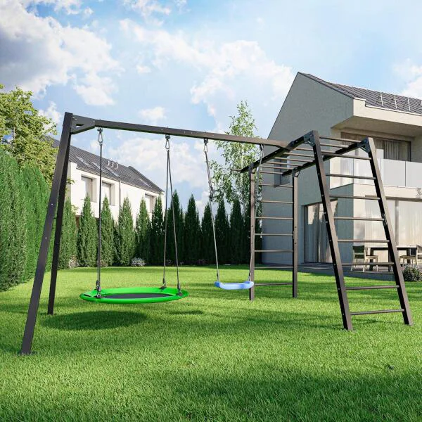 Funkční zahradní sestava od MARBO Sport MO-Z7 skládající se z konstrukce pro 2 houpačky a gymnastických žebřin, které děti využijí i jako prolézačku. Sestava je ideální pro trénink, nebo rodinnou zábavu v soukromí vlastní zahrady.