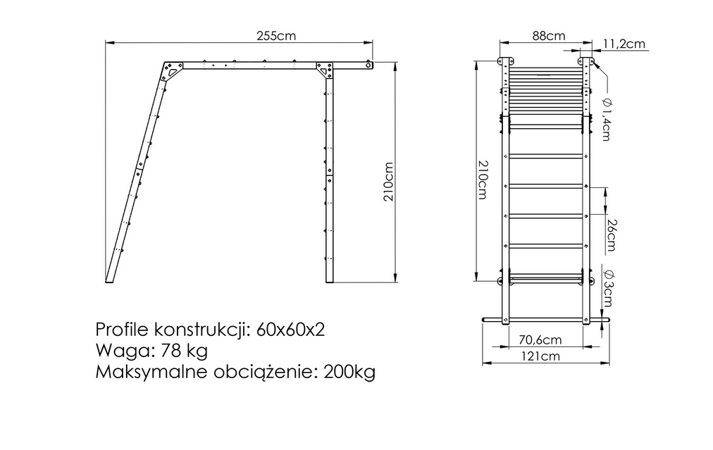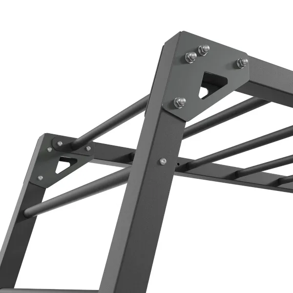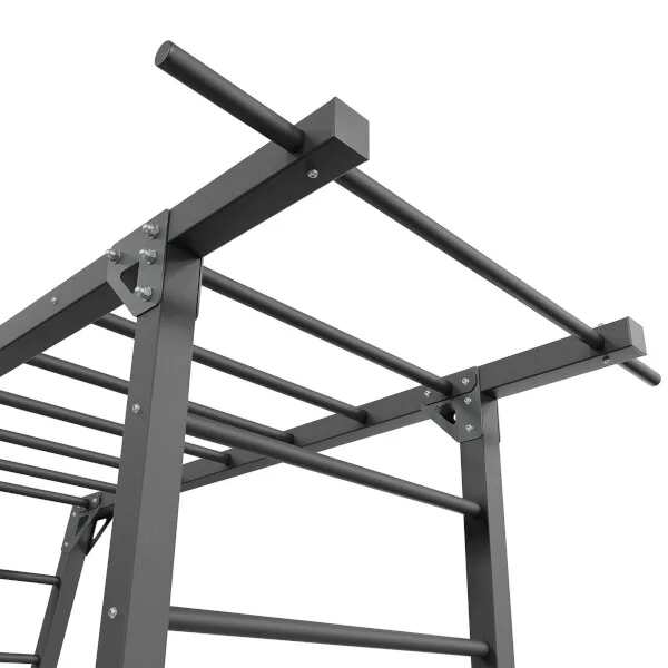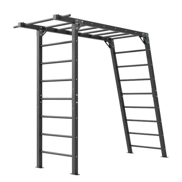 Žebřiny jsou ve svislé poloze a mají výšku 210 centimetrů a 8 příček. Příčky jsou od sebe ve vzdálenosti 26 cm a mají průměr 3 cm. V úrovni poslední příčky se nachází předsunutá hrazda s šířkou 121 cm. Tato strana konstrukce lze využít na širokou škálu cviků, lze na ni připevnit také tréninkové gumy a nebo závěsný posilovací systém. Z druhé strany konstrukce se nachází šikmý a horizontální žebřík, který najde ideální využití jako prolézačka pro děti.
