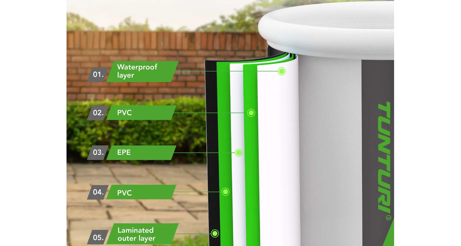 Ochlazovací káď je tvořená robustní konstrukcí, je odolná, a to i vůči povětrnostním vlivům, neboť disponuje 5 vrstvami izolace. Snadno se sestavuje, postavit si ji můžete na zahradě, terase i balkoně. Díky skládací konstrukci a příslušenství v podobě opěrných tyčí a nožní pumpy je připravená k použití za pár minut.