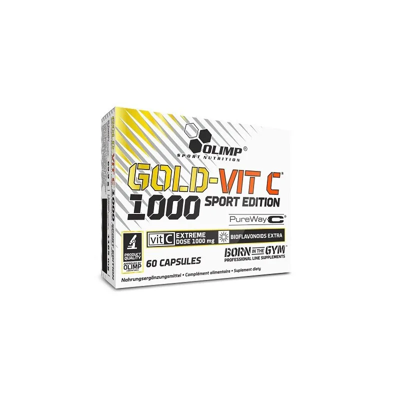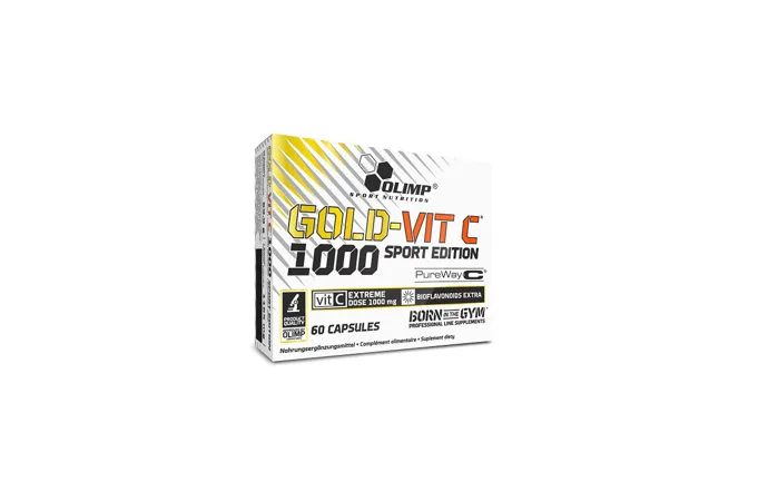 OLIMP Gold-Vit C 1000 Sport Edition je doplněk stravy obsahující vitamín C v kapslích v patentované formě vitamínu C PureWay-C®. Vitamín C: přispívá k udržení normální funkce imunitního systému během intenzivního fyzického výkonu a po něm. /Příznivých účinků je v těchto případech dosaženo s denním příjmem cca 200 mg vitaminu C (doporučený denní příjem činí 80 mg vitaminu C)/. Dále přispívá k normálnímu energetickému metabolismu, k normální činnosti nervové soustavy, ke tvorbě kolagenu, k ochraně buněk před oxidativním stresem. Produkt je určen pro dospělé se zvýšenou potřebou vit.C, zvláště pro fyzicky aktivní jedince.