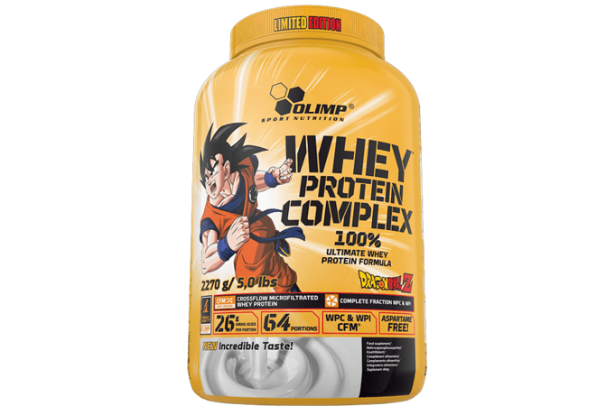 OLIMP WHEY PROTEIN COMPLEX je silný syrovátkový koncentrát a izolát v prášku s vysokým obsahem bílkovin v limitované designové edici anime Dragon Ball. Jde o výživu určenou k vyrovnávání výdajů při zvýšené svalové námaze u aktivních jedinců a pro budování svalové hmoty. Whey Protrein Complex je vhodný při dietách, neboť obohacuje potravu o bílkoviny (efektivní kombinace syrovátkových proteinů). Vysoká biologická hodnota syrovátkového proteinu je dobře známá, a proto je syrovátka obecně považována za nejhodnotnější zdroj bílkovin.