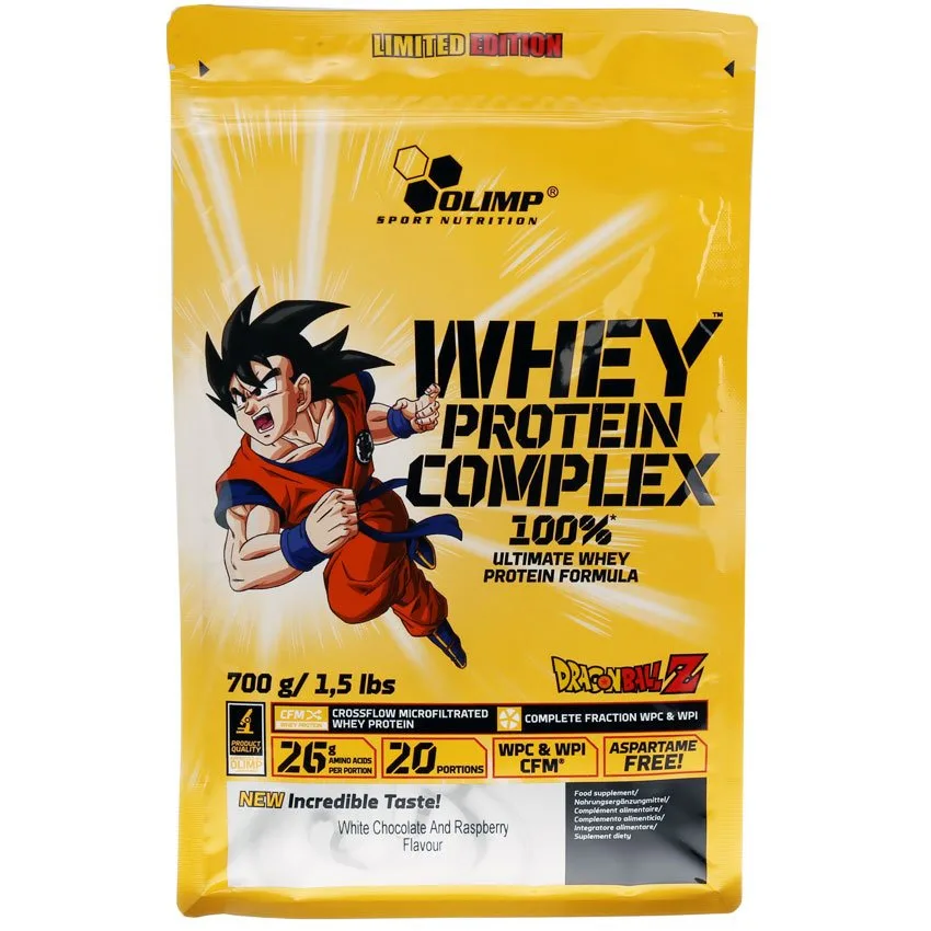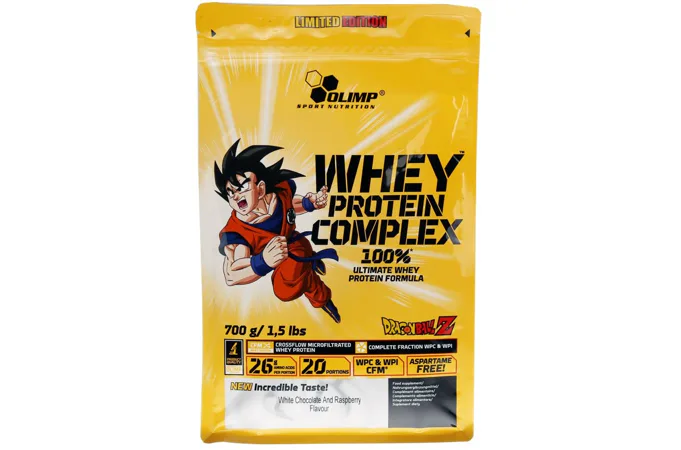 OLIMP WHEY PROTEIN COMPLEX je silný syrovátkový koncentrát a izolát v prášku s vysokým obsahem bílkovin v limitované designové edici anime Dragon Ball. Jde o výživu určenou k vyrovnávání výdajů při zvýšené svalové námaze u aktivních jedinců a pro budování svalové hmoty. Whey Protrein Complex je vhodný při dietách, neboť obohacuje potravu o bílkoviny (efektivní kombinace syrovátkových proteinů). Vysoká biologická hodnota syrovátkového proteinu je dobře známá, a proto je syrovátka obecně považována za nejhodnotnější zdroj bílkovin.