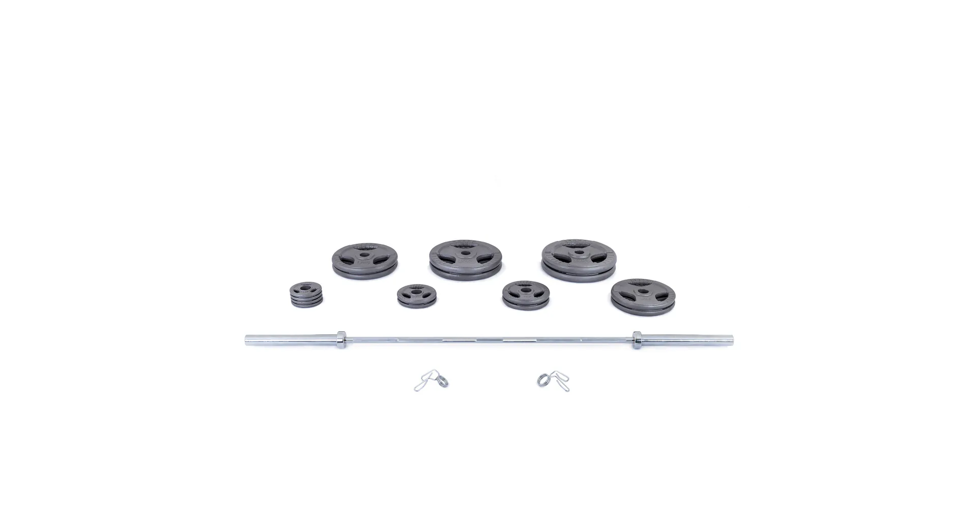 Součástí olympijského setu je velká obouruční hřídel na činku 2 200 mm včetně uzávěrů a sada litinových kotoučů s odolnou povrchovou úpravou HAMMERTONE určenou pro komerční využití. Všechny komponenty mají sandardní parametry. Uvedená váha setu je včetně osy.