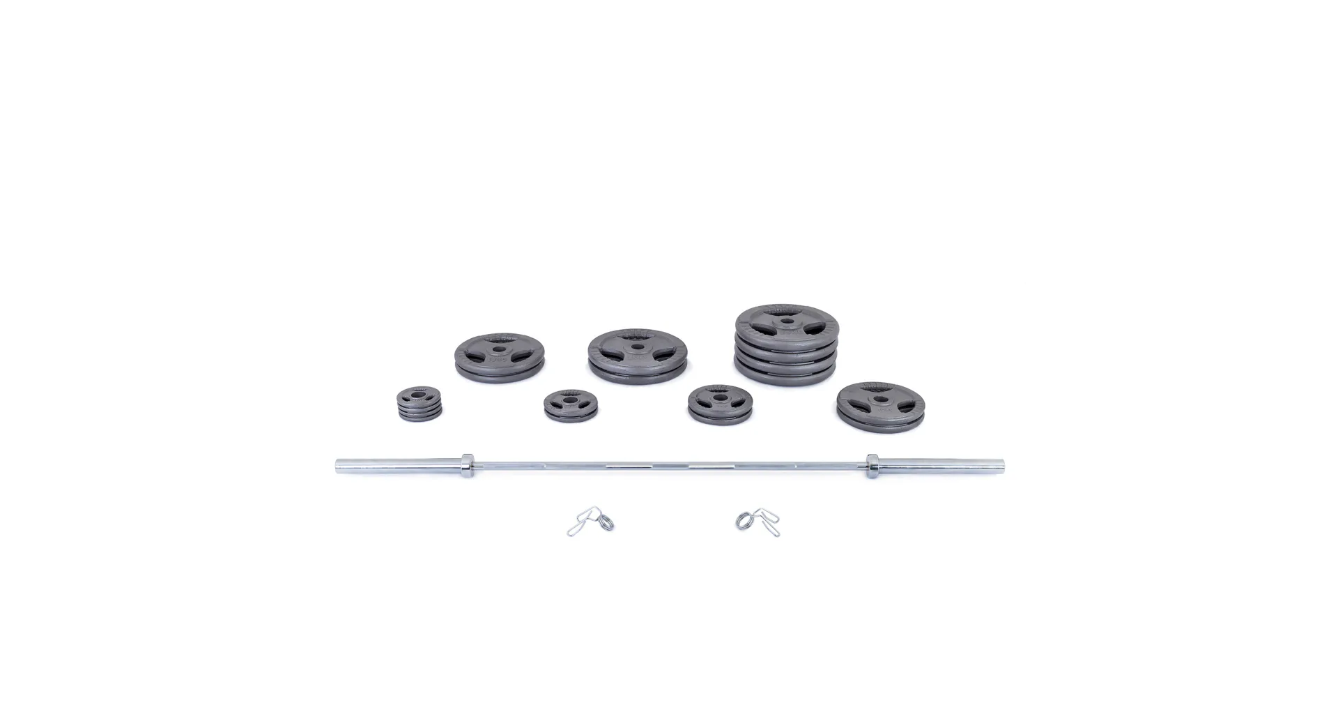 Součástí olympijského setu je velká obouruční hřídel na činku 2 200 mm včetně uzávěrů a sada litinových kotoučů s odolnou povrchovou úpravou HAMMERTONE určenou pro komerční využití. Všechny komponenty mají sandardní parametry. Uvedená váha setu je včetně osy.