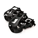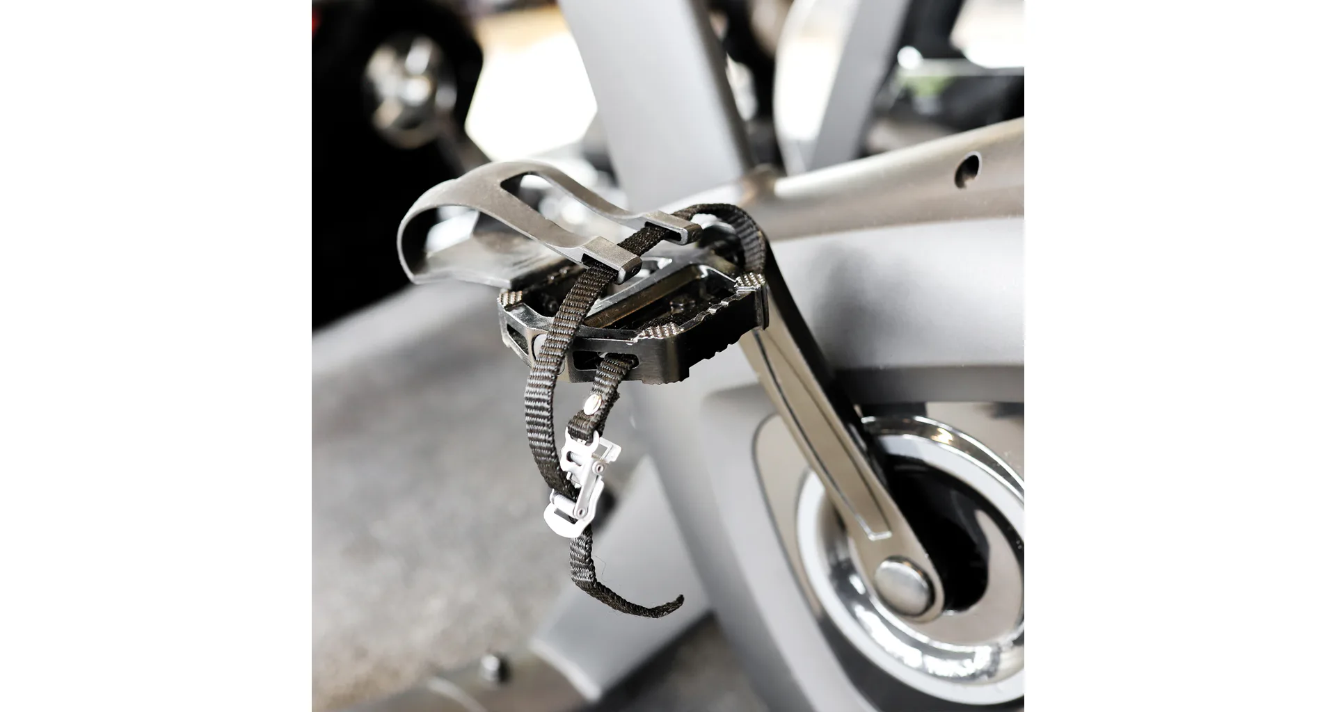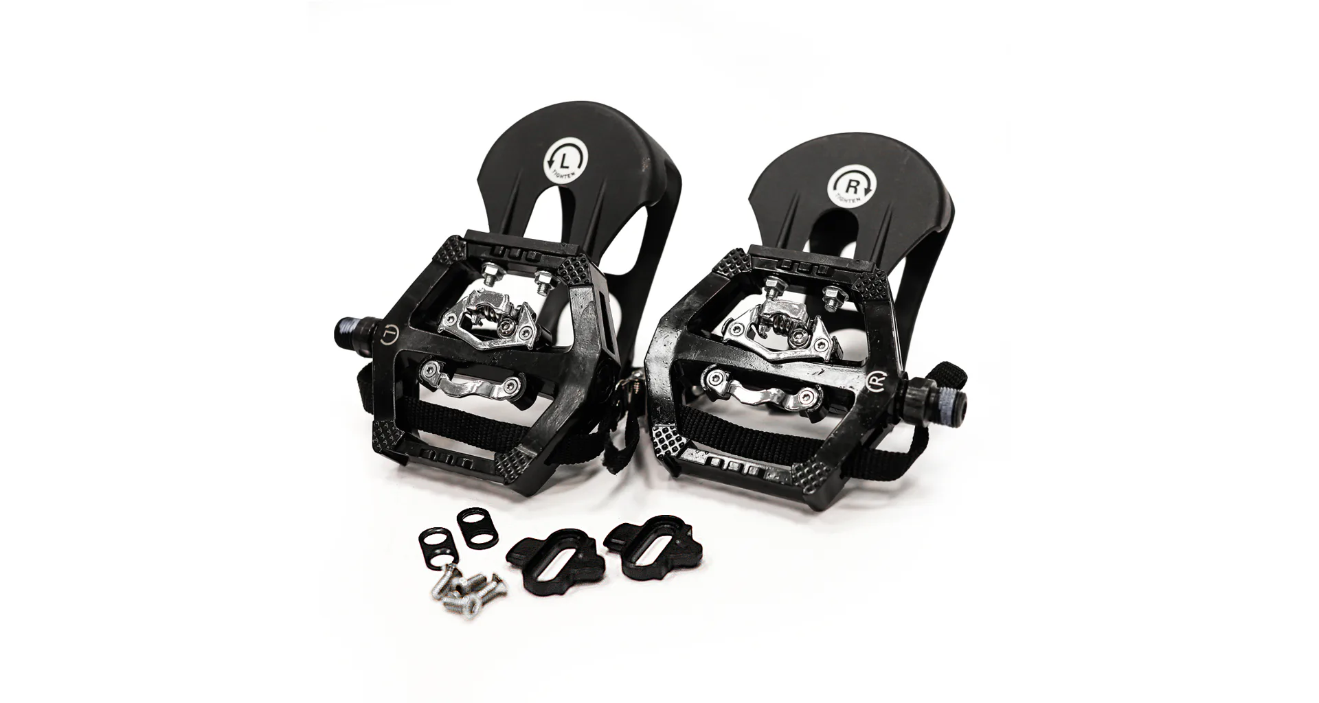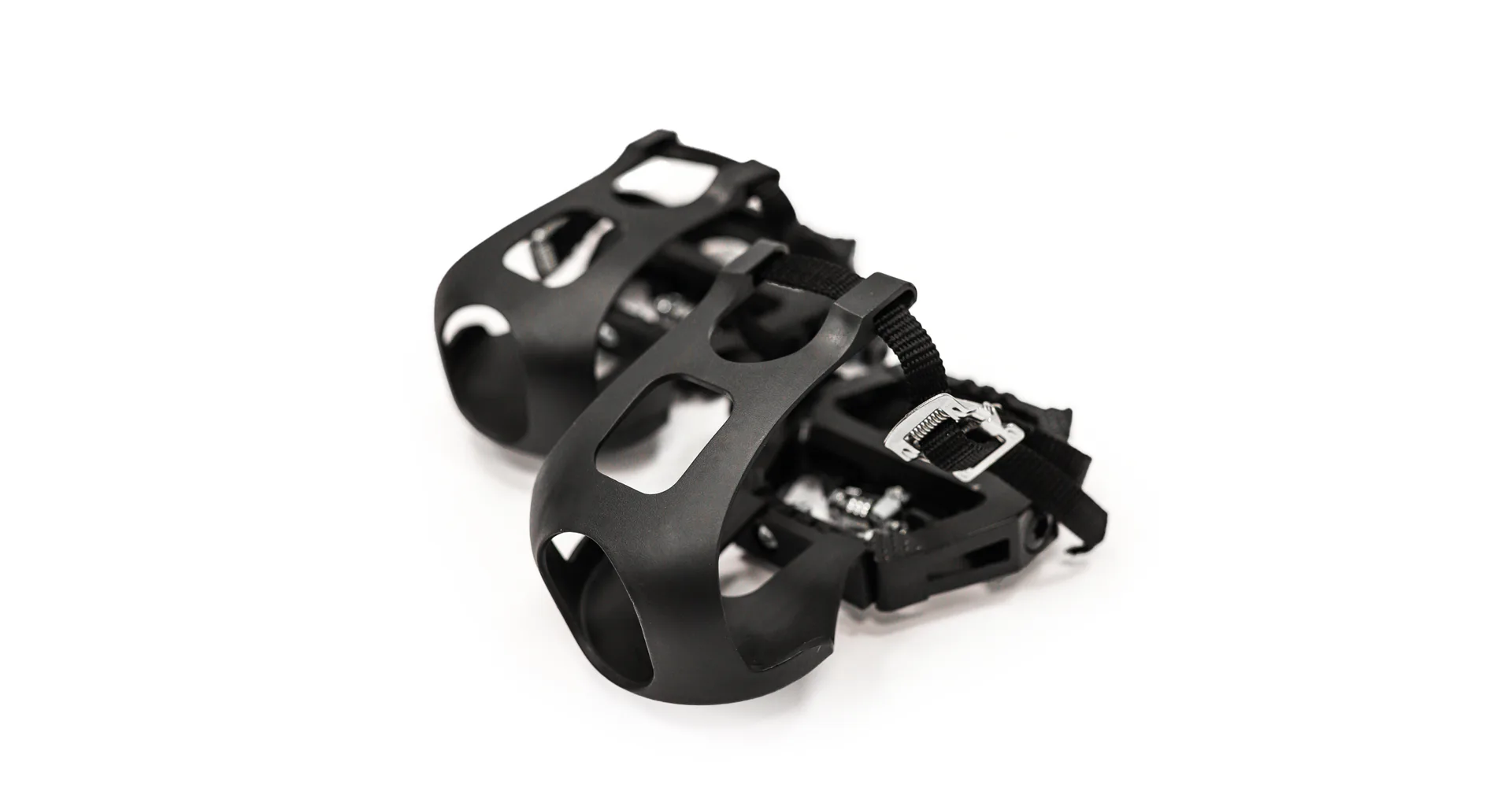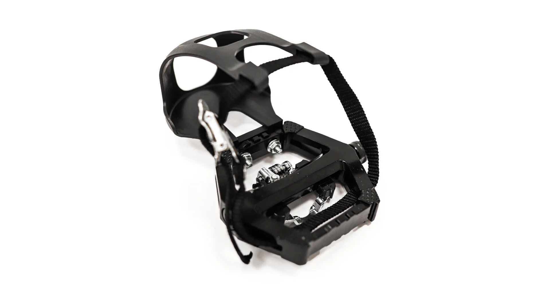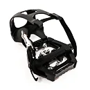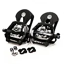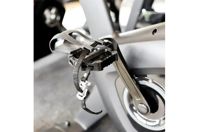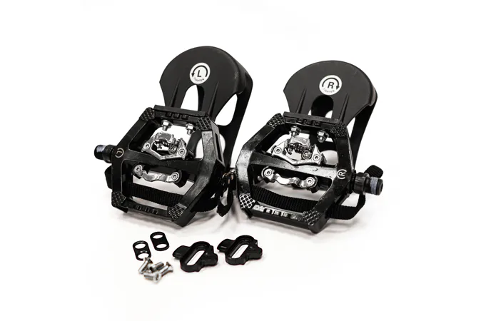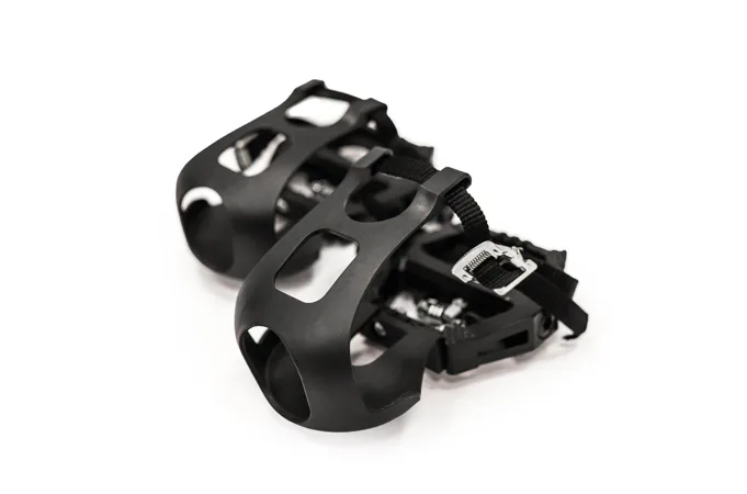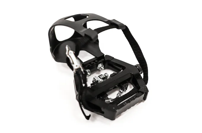 Pedály jsou osově vyvážené, s horní strany jsou opatřeny protiskluzovou úpravou, nárt obepíná plastová klipsna s řemínkem, jehož délku lze nastavit dle velikosti obuvi a individuálních potřeb.