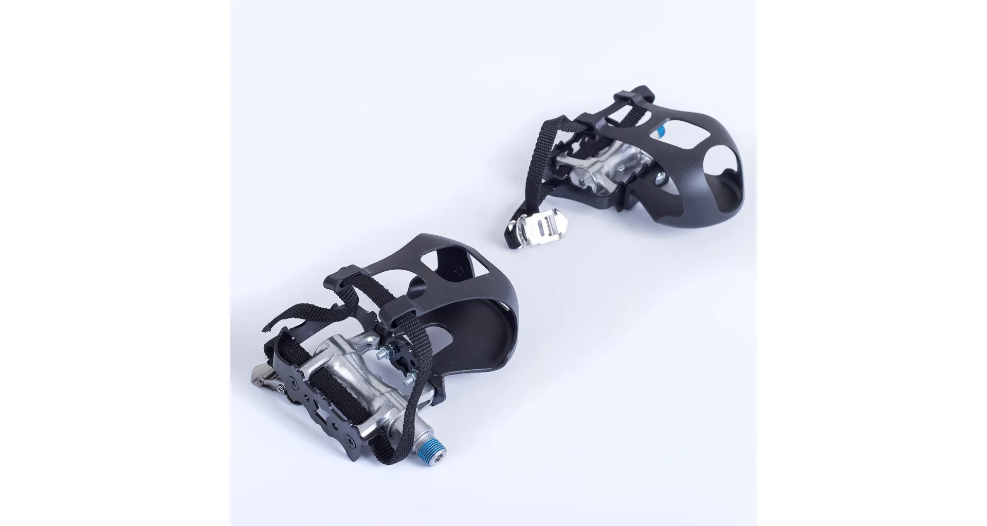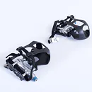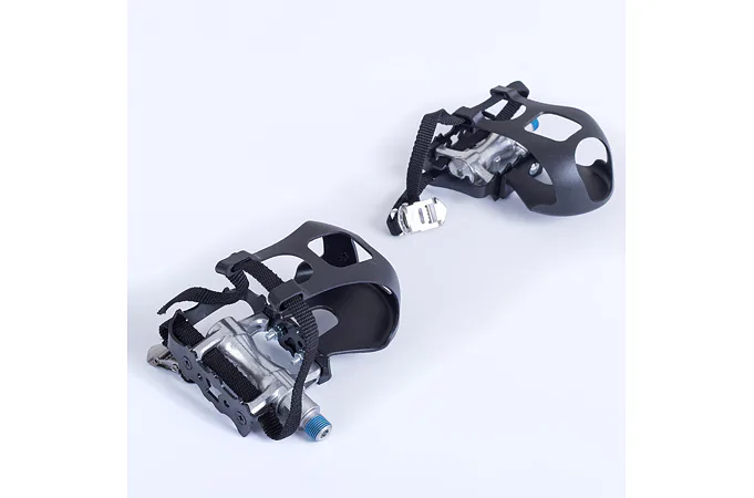 Pedály jsou osově vyvážené, s horní strany jsou opatřeny protiskluzovou úpravou, nárt obepíná plastová klipsna s řemínkem, jehož délku lze nastavit dle velikosti obuvy a individuálních potřeb.