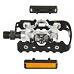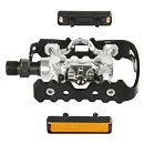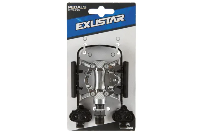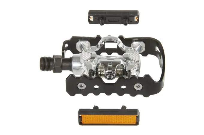 Sada kvalitních, oboustranných cyklistických MTB pedálů. Pedály jsou osově vyvážené, s horní strany jsou opatřeny protiskluzovou úpravou, nárt obepíná plastová klipsna s řemínkem, jehož délku lze nastavit dle velikosti obuvi a individuálních potřeb.