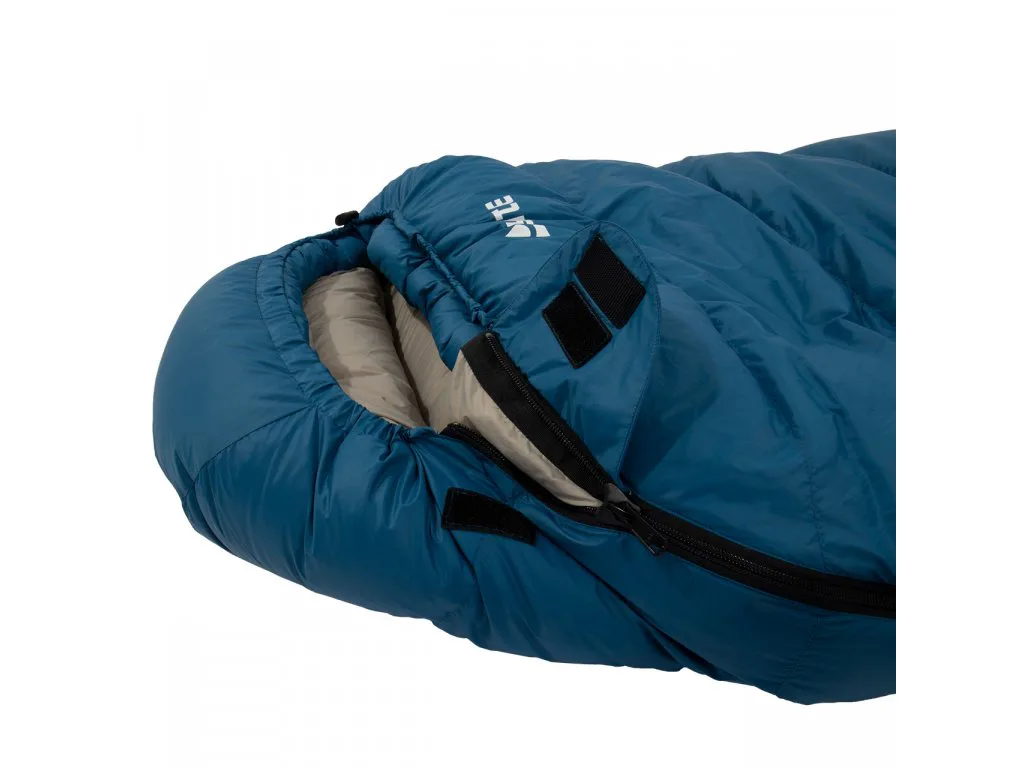 Zapínání: spacák je vybaven značkovým zipem YKK se speciálním plastovým chráničem, který zabraňuje vniknutí látky do jezdce a samovolnému rozepínání. U hlavy je zip ještě zajištěn klopou na suchý zip, která zamezuje samovolnému otevření zipu.