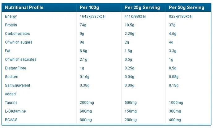 Každá dávka obsahuje speciální aditivum aminokyselin Lean Mass Amino Blend - L-glutamin, L-valin, L-leucin, L-isoleucin, taurin.