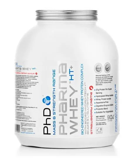 Pharma Whey HT+ je novou, inovovanou verzí řady PhD Pharma Whey, tedy jednoho z nejprodávanějších proteinových přípravků na trhu. Základ tvoří PhD Nutrition Hydro-Tech Plus Whey Protein Matrix, tedy proteinová směs, která je nově doplněna o kvalitní hydrolyzát syrovátkového izolátu Hydro-Tech+, který je zdrojem tzv. rychlých aminokyselin. Aminokyseliny představují základní stavební kámen bílkovin. Bílkoviny mají anabolický efekt – přispívají k růstu svalové hmoty. Jejich dalším přínosem je antikatabolický efekt - přispívají k udržení svalové hmoty v situacích, kdy hrozí její katabolizace, jako je intenzivní trénink či redukční dieta. Nyní ještě lepší chuť a rozpustnost!