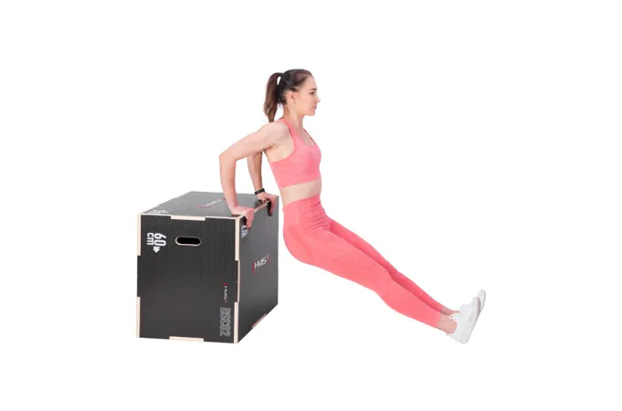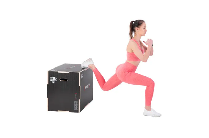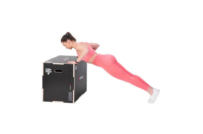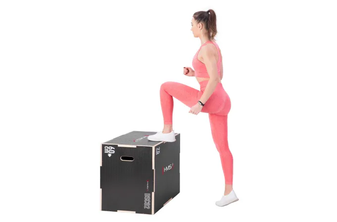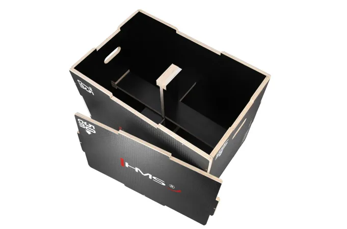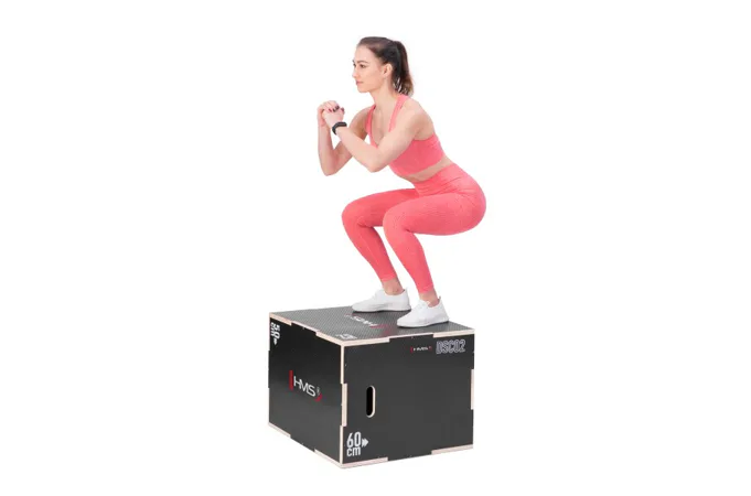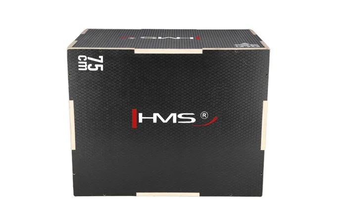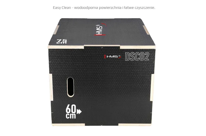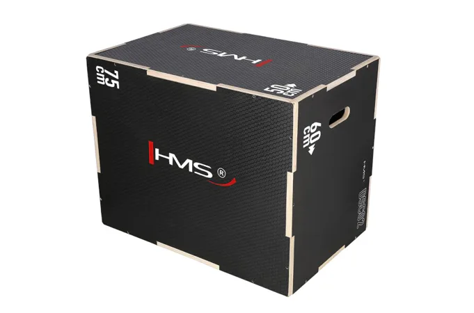 Plyometrický box HMS DSC02 je bedna určena pro kondiční trénink. Box je nedílnou součástí každého crossfitového centra, pomůckou profesionálních sportovců nebo i atletů. Vyroben je z 18 mm překližky a má klasické rozměry 75 x 60 x 50 cm (30 x 24 x 20 palců)..Jednotlivé stěny mají výkroje a při skládání skříně do sebe zapadají jako "puzzle". Výřezy usnadňují montáž a napomáhají lepšímu rozložení zátěže při doskoku, tím se prodlužuje životnost skříně.Povrch boxu je potažen speciální vrstvou, která zamezuje sklouznutí boty a také lze snadno očistit. Na dvou protilehlých stěnách se nachází otvory pro snadné přenášení.