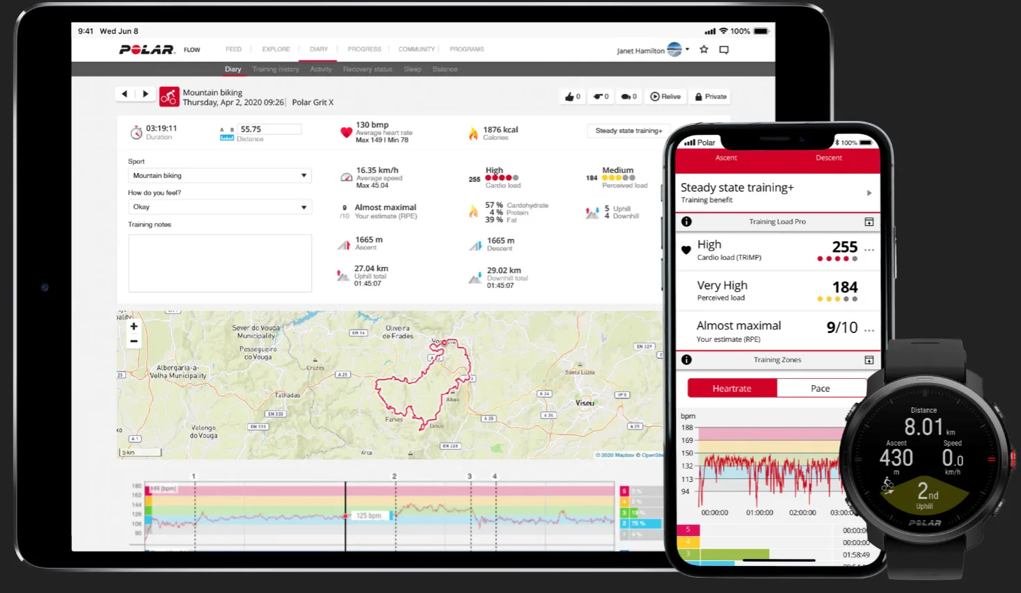 Plánovač tras s aplikací Komoot - spojením aplikací Polar Flow a Komoot, lze získat optimální plánovač tras již známý "Route guidance"-navigace po trase. V aplikaci Komoot je možné vytvořit trasu, v mapách. Po přenosu do Polar Flow a synchronizaci s hodinkami, funkce pracuje tak, že hodinky upozorní vždy s předstihem na blížící se křižovatku a graficky naznačí směr, kterým pokračovat. Zajímavé je, že s Komoot získává Polar data o všech křižovatkách, tu vykreslí i když trať pokračuje rovně. !!! Aplikace Komoot je placená, cena je závislá podle regionu, který se "odemyká".