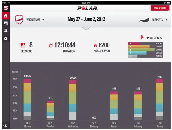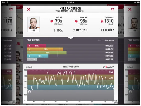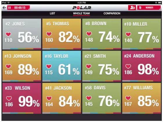 Na displeji je možné aktuální sledování hodnot tepové frekvence v jednotkách „bpm“ tedy počtu srdečních stahů za minutu a vyjádření v % podle predikované hodnoty jedince. Následné náhledy umožňují pozorování jedinců, případně celého týmu, porovnávání jednotlivých sportovců během tréninku. V rámci záznamu je možné sledovat i průměrnou tepovou frekvenci a maximální dosaženou během záznamu, calorický výdej, podíl strávený v jednotlivých aerobních zónách, křivku tepové frekvence, ….. včetně týdeních přehledů.Záznamy je možné sdílet prostřednictvím emailu ve formátu PDF.