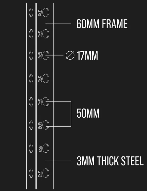 Přesné nastavení a variabilita – Klec disponuje 34 použitelnými otvroy s vnitřním průměrem 17 mm a roztečí 50 mm, které umožňují přesné nastavení výšky J-háků a vnitřních bezpečnostních zarážek podle vašich potřeb. Laserem vyřezávané číslování na přední i zadní straně profilů usnadňuje rychlé a přesné nastavení pro různé cviky, jako jsou dřepy, bench press či tlaky nad hlavu.