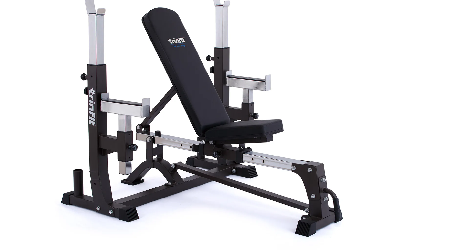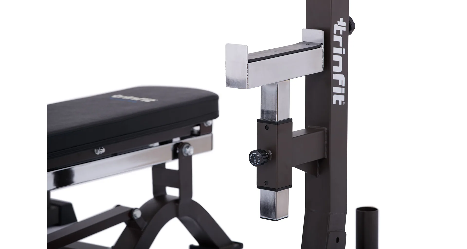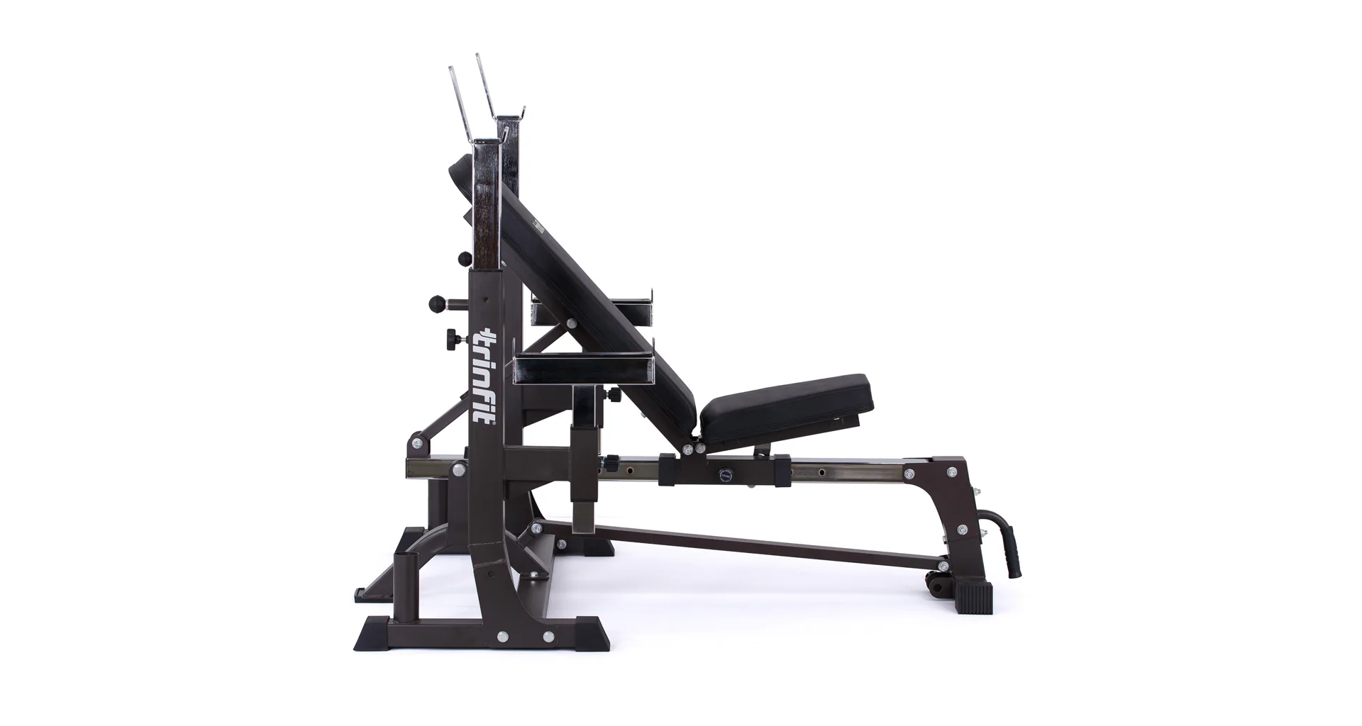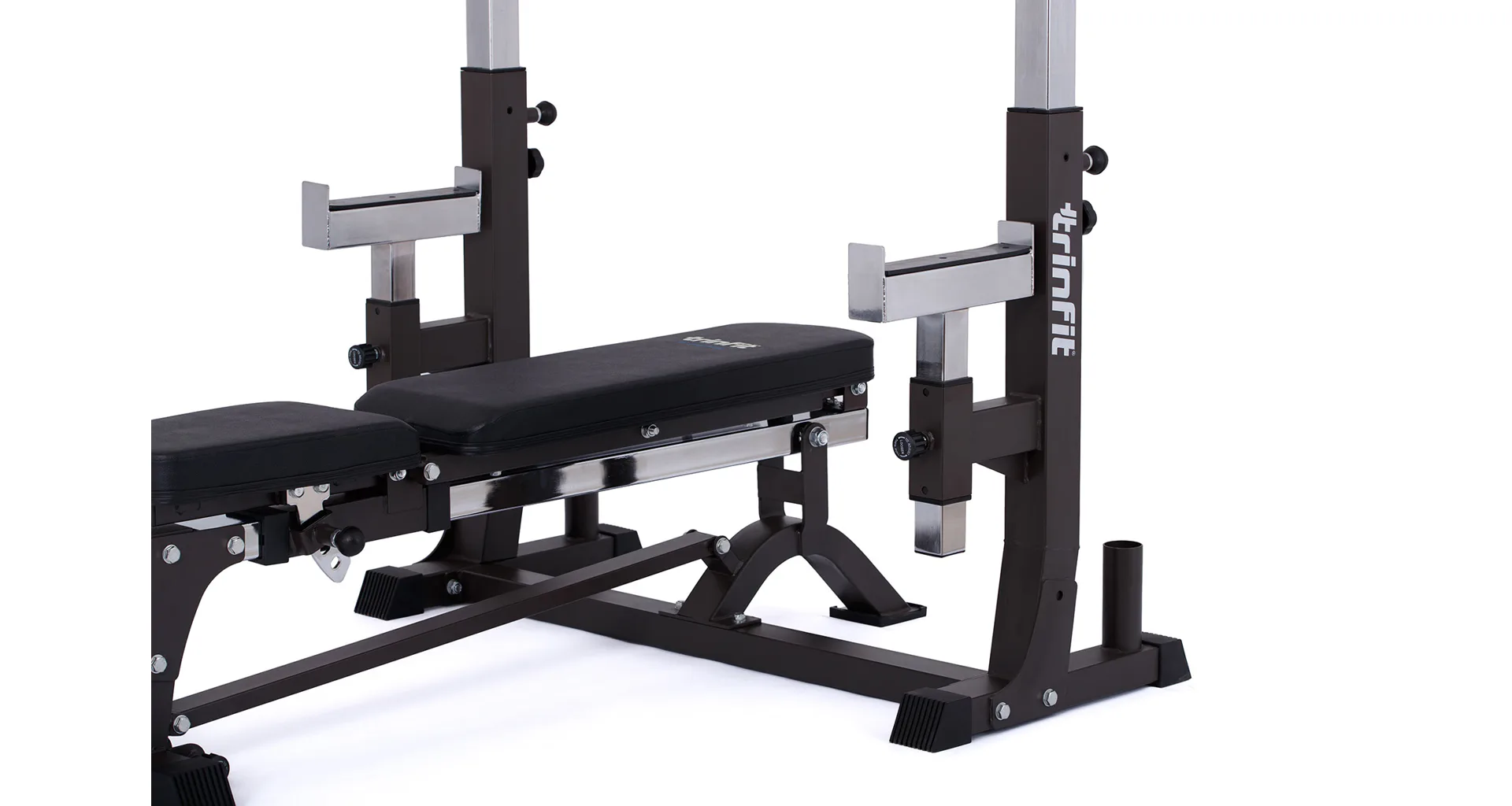 TRINFIT F7 Pro Benchpress má unikátní mechanismus nastavení lavice. Ta je totiž umístěná na kolejnici, která je opatřena 9 otvory, pro 9 poloh lavice. Lavici lze tedy položit do úplné roviny (pro benchpress), ale i do sedu (pro tlaky na ramena s velkou činkou). Pokud chcete procvičit prsa z úhlu, pak vám bude pravděpodobně vyhovovat poloha lavice něco mezi sedem a lehem.