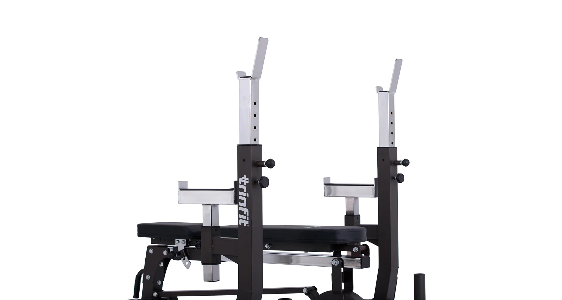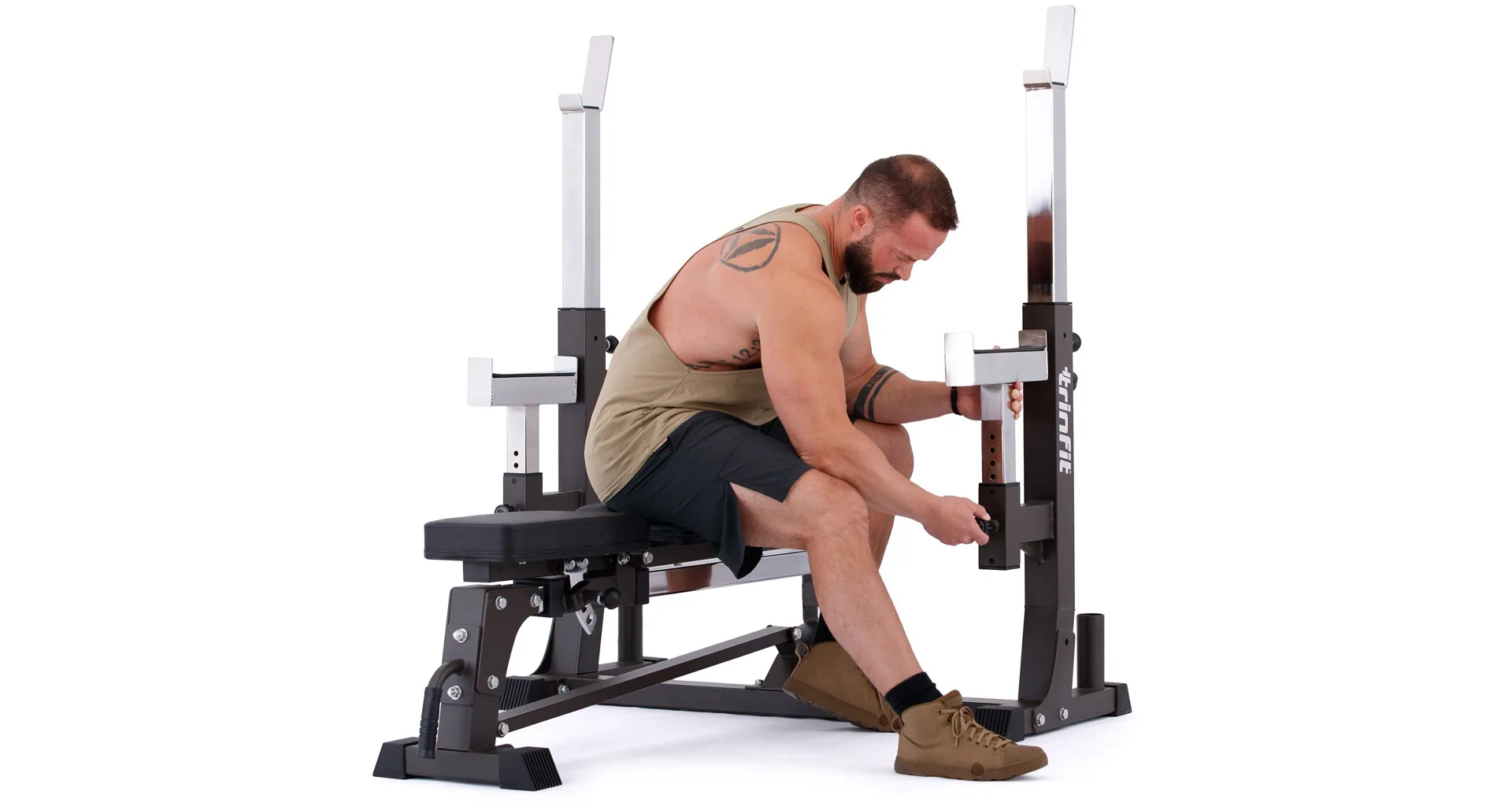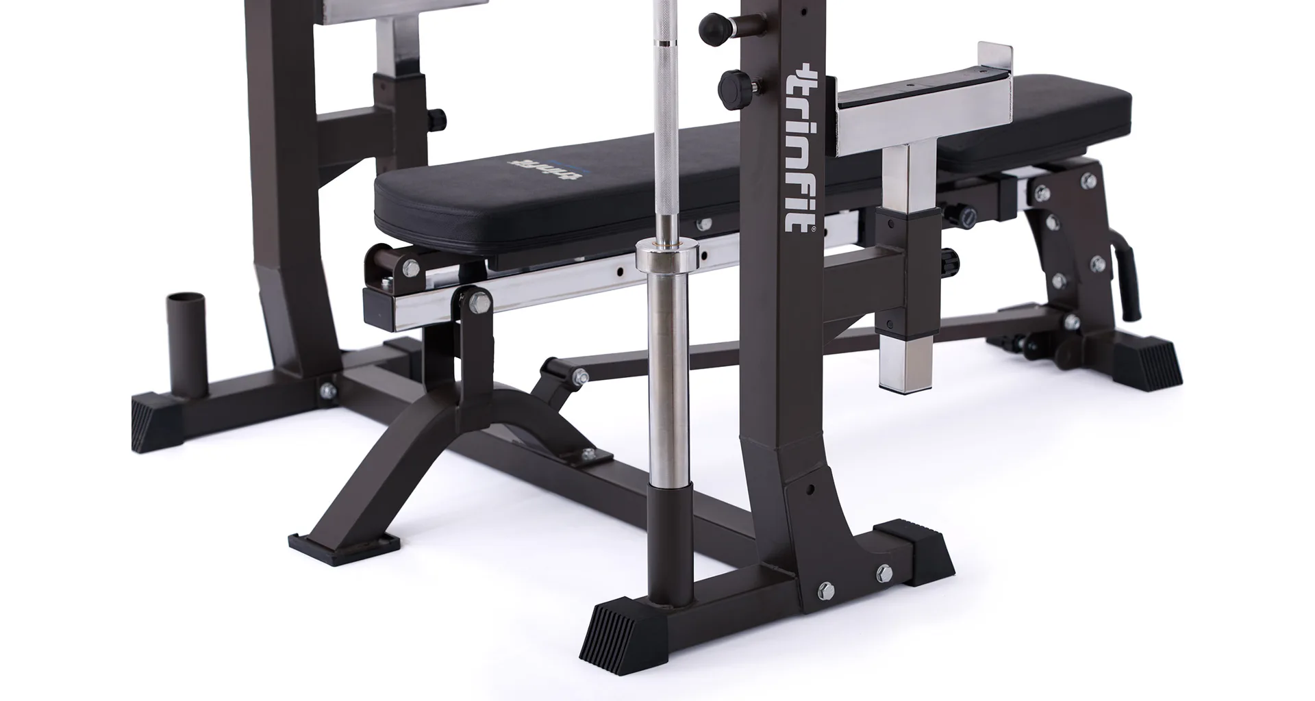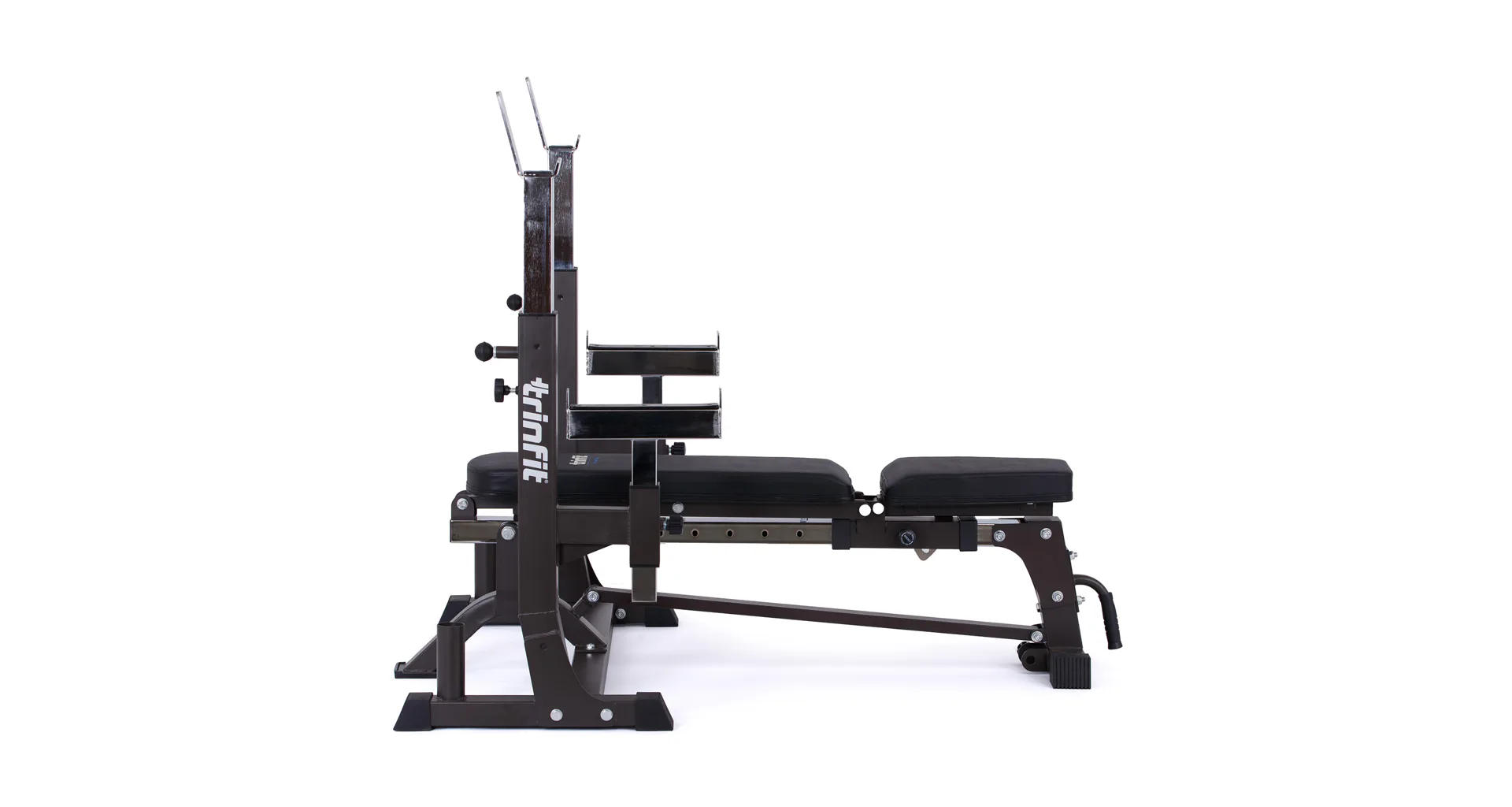 TRINFIT F7 Pro Benchpress má unikátní mechanismus nastavení lavice. Ta je totiž umístěná na kolejnici, která je opatřena 9 otvory, pro 9 poloh lavice. Lavici lze tedy položit do úplné roviny (pro benchpress), ale i do sedu (pro tlaky na ramena s velkou činkou). Pokud chcete procvičit prsa z úhlu, pak vám bude pravděpodobně vyhovovat poloha lavice něco mezi sedem a lehem.