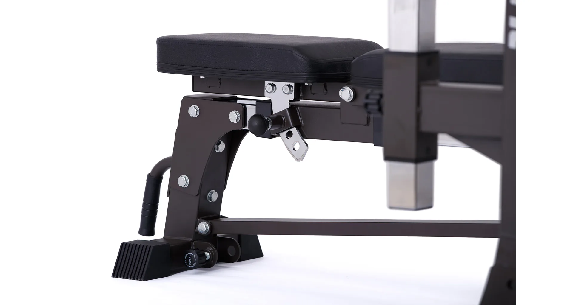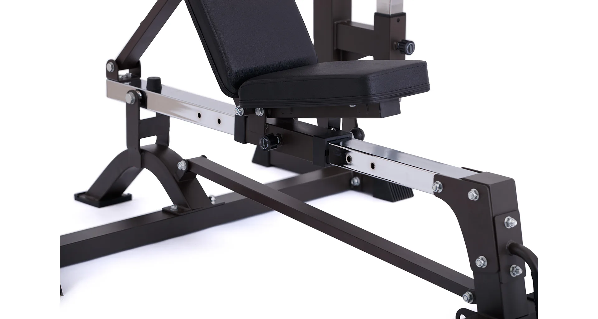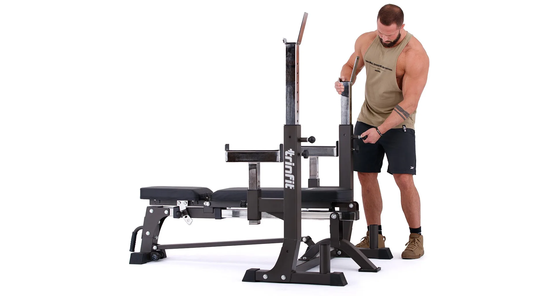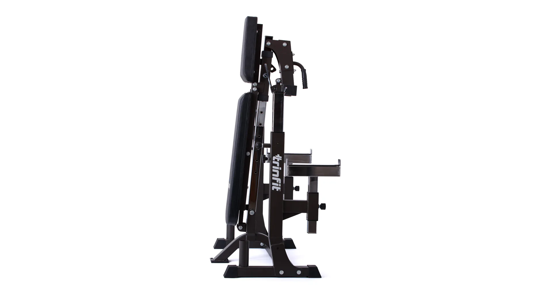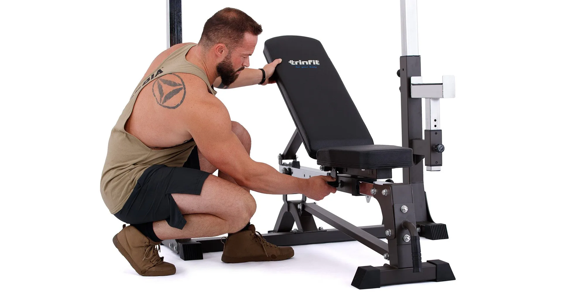 TRINFIT F7 Pro Benchpress má unikátní mechanismus nastavení lavice. Ta je totiž umístěná na kolejnici, která je opatřena 9 otvory, pro 9 poloh lavice. Lavici lze tedy položit do úplné roviny (pro benchpress), ale i do sedu (pro tlaky na ramena s velkou činkou). Pokud chcete procvičit prsa z úhlu, pak vám bude pravděpodobně vyhovovat poloha lavice něco mezi sedem a lehem.