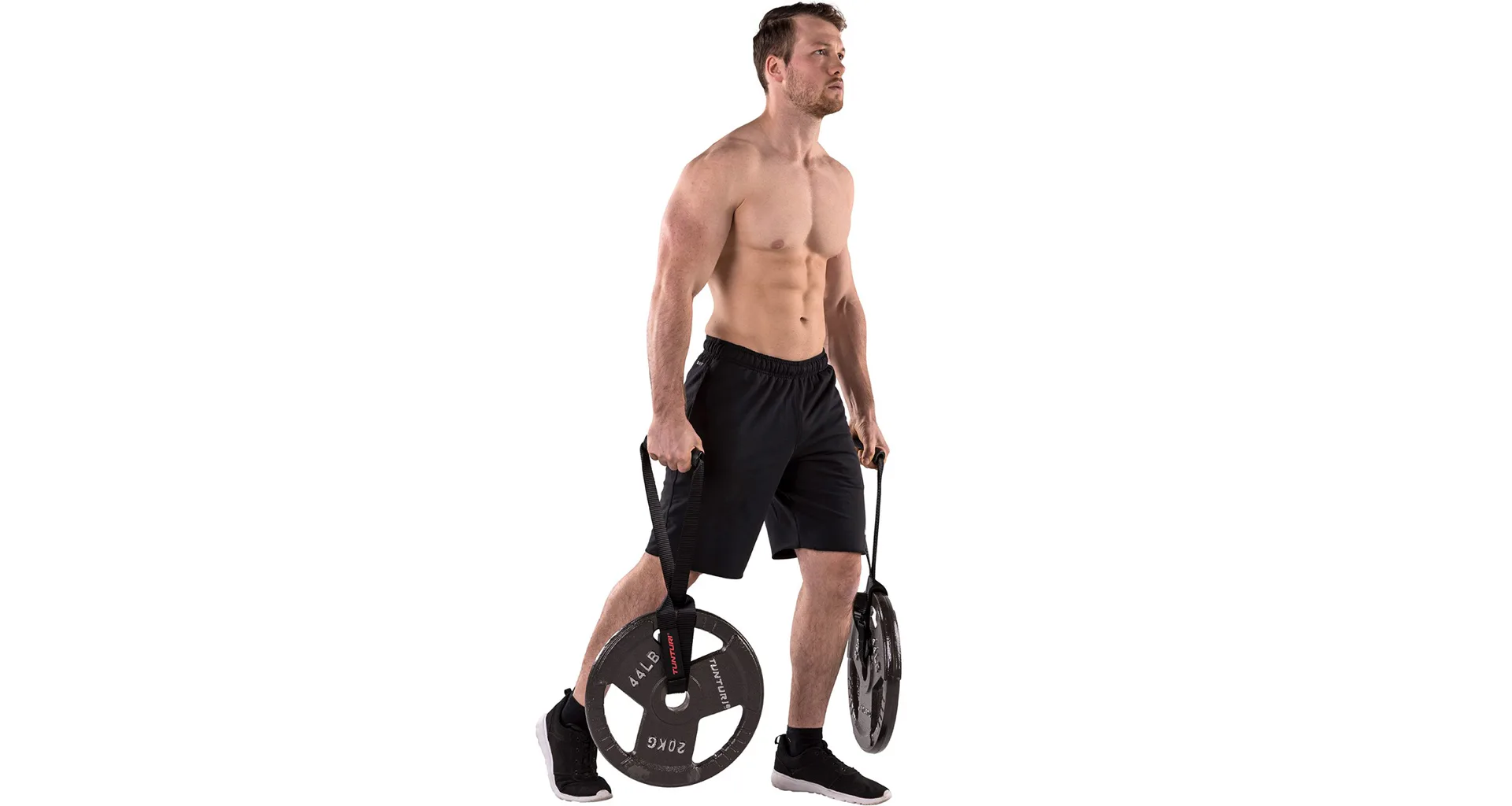 Posilovací pomůcka farmářské kufry TUNTURI je doplněk pro zpestření tréninku. Set obsahuje dva kusy 2 m dlouhých nylonových pásů s úchyty a pevnými přezkami. Pomocí těch přezek můžete na pásy připevnit libovolný kotouč (viz. foto). Farmářské kufry TUNTURI mohou být použity s kotouči o průměru 30 mm i 50 mm. Tato pomůcka zajišťuje optimální trénink horní části těla a zlepšuje sílu uchopení a další svalový růst.