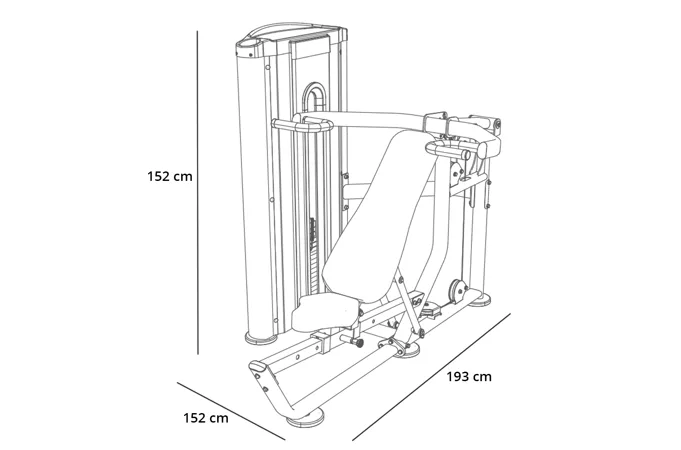 Posilovač prsou a ramen L080 se rozkládá na malém půdorysu o rozměrech (d x š x v) 193 cm, 132 cm a 152 cm, nezabere vám tedy moc prostoru a stále zůstane dostatek místa i na další stroje.