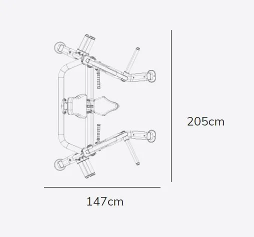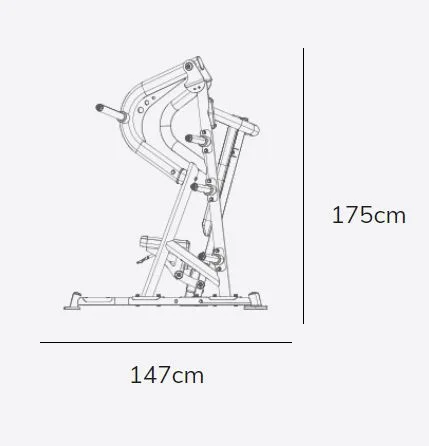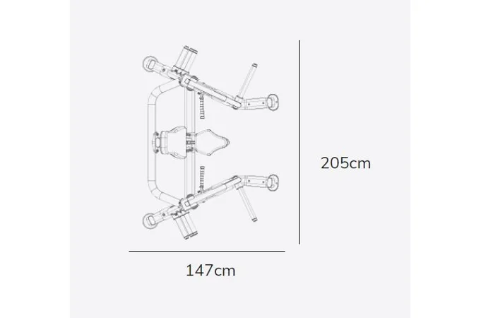 Posilovač prsou PL070 se rozkládá na malém půdorysu o rozměrech (d x š x v) 147 cm, 205 cm a 175 cm, nezabere vám tedy moc prostoru a stále zůstane dostatek místa i na další stroje.