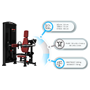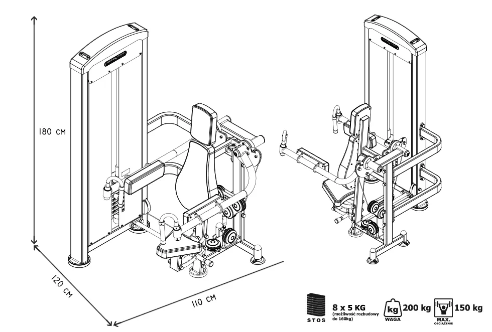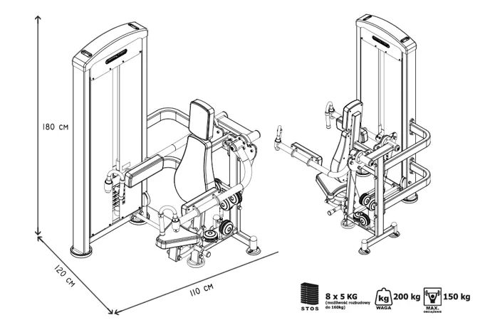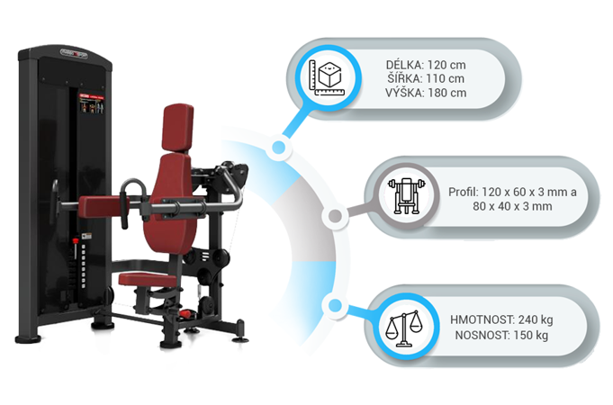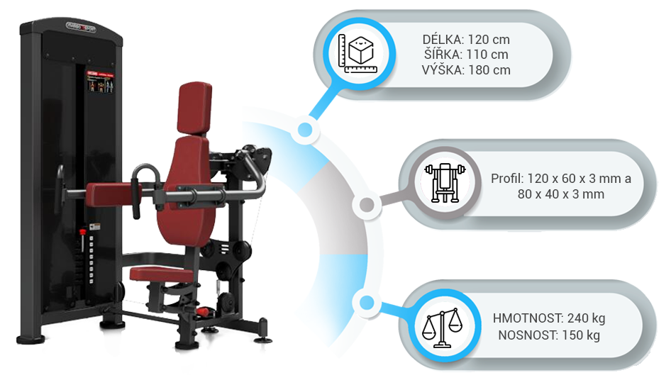 Zátěž tvoří 8ks 5kg cihel. Celková váha závaží dodávána se strojem je tedy 40kg s možností rozšíření až do 160kg. Ramena mají na sobě nezávislý chod. To zaručuje vysokou efektivitu tréninku. Veškeré nastavení se provádí červenými, pružinovými kolíky. Sedadlo má čtyři polohy. Polstrovaní je ze syntetické kůže sešité režnou nití značky COATS vyplněné tvrdou pěnou, to celé je na 3mm hrubé, ocelové desce.