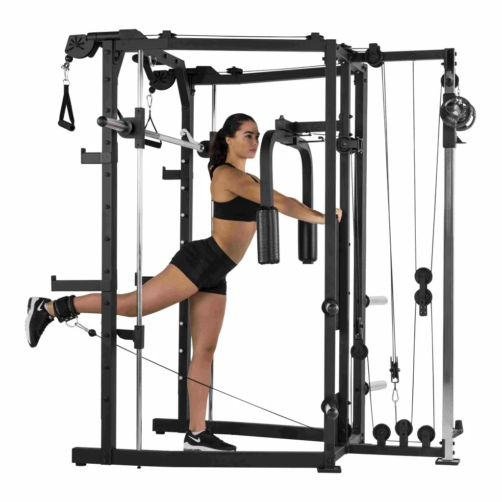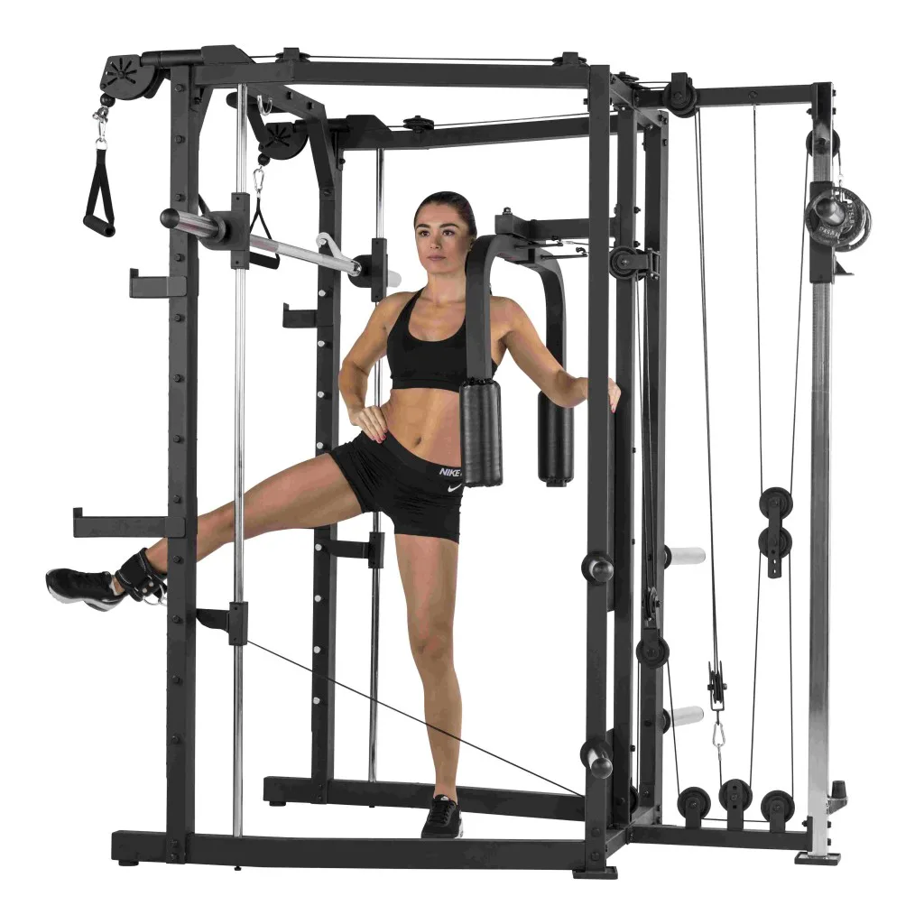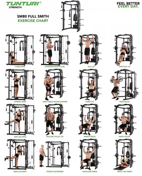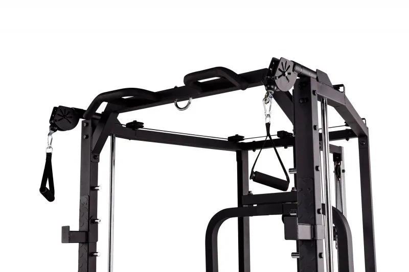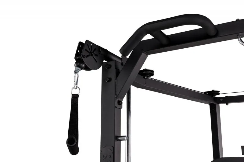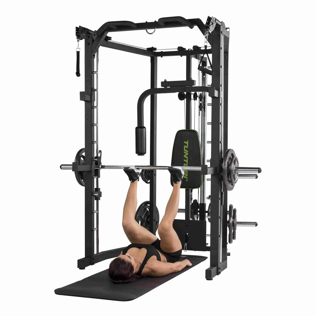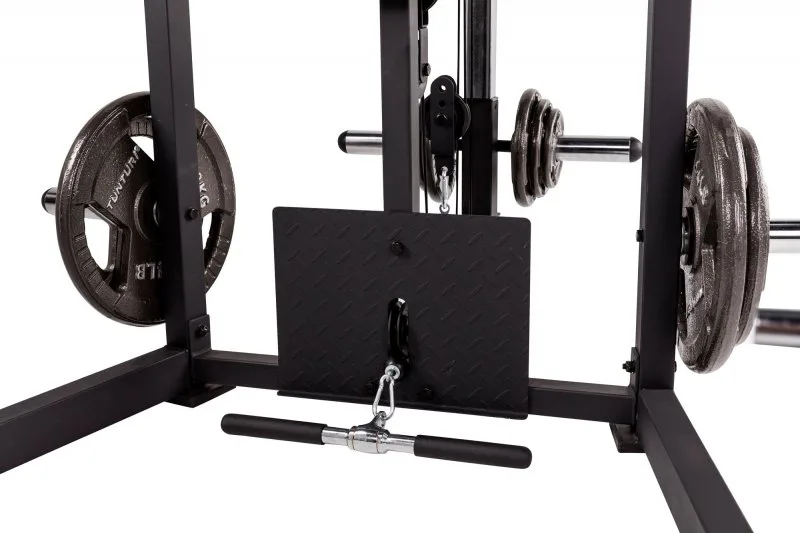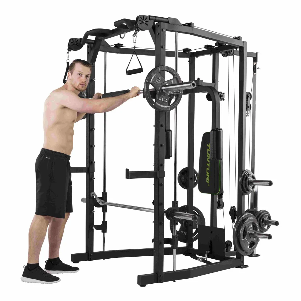 Konstrukce TUNTURI SM80 Full Smith je universální posilovací stroj určený jak pro nenáročné domácí cvičení. Praktická kombinace klasické stojanové konatrukce s hrazdou, multipressu a kladek umožňuje procvičení desítek cviků na všechny svalové partie. určená pro veškeré cviky s činkami, či osou zabudovanou v konstrukci mulipressu.