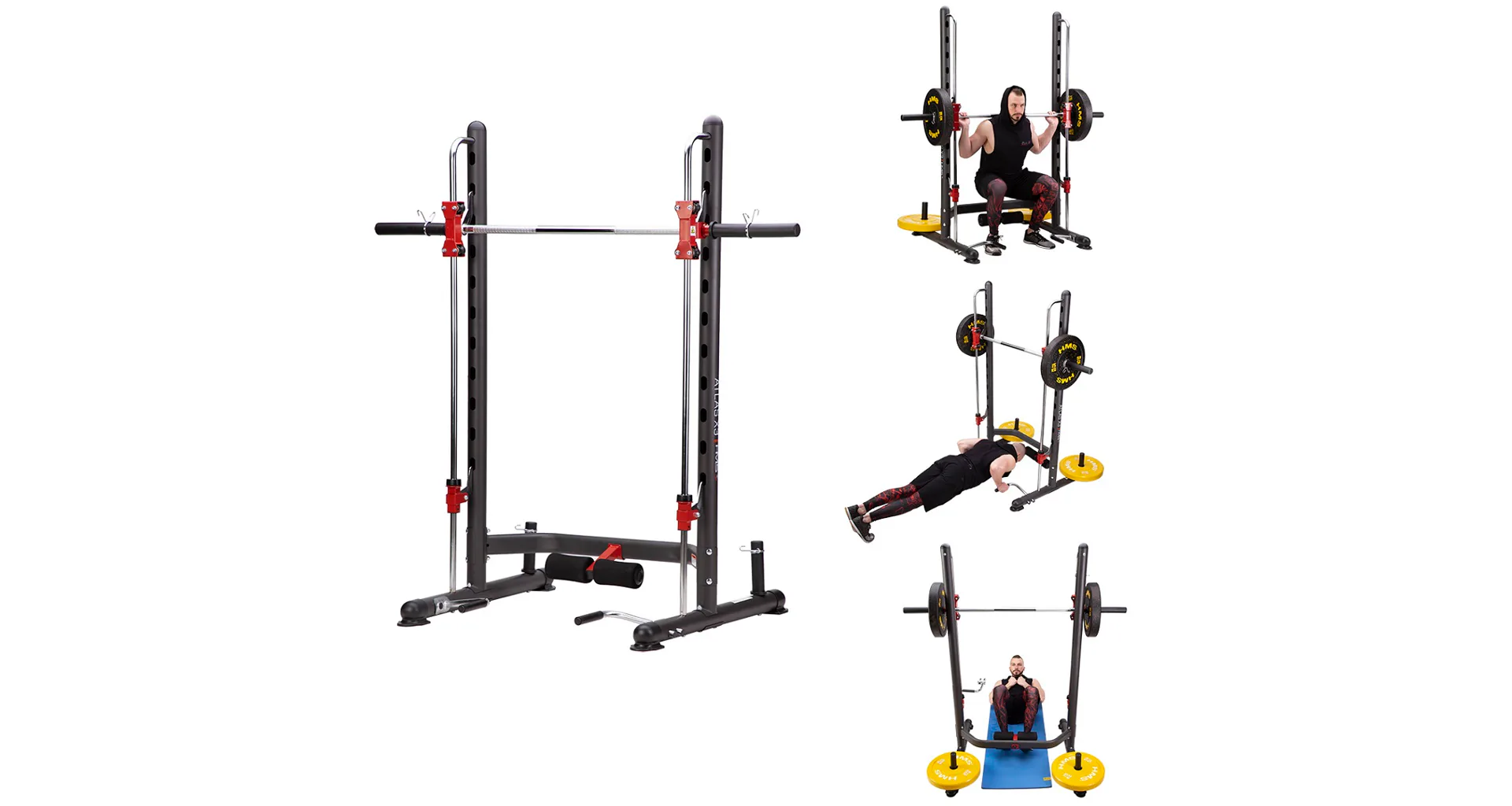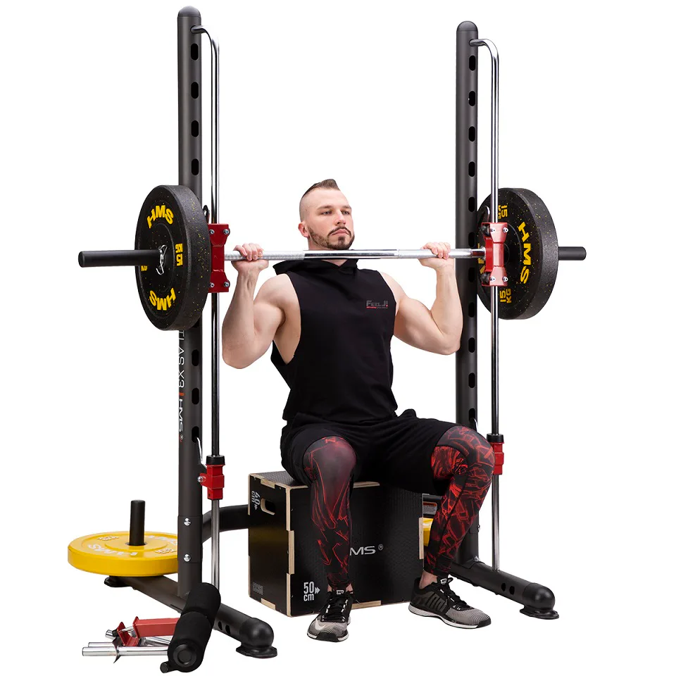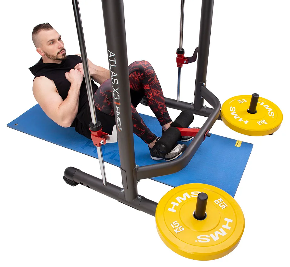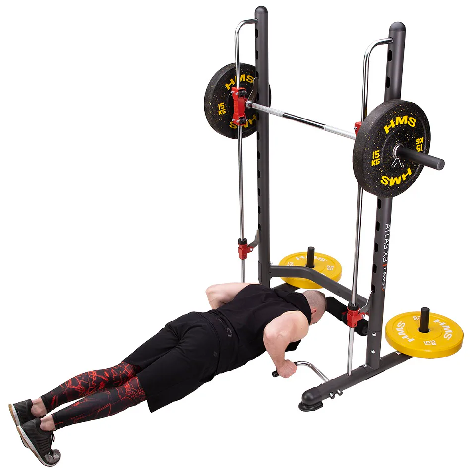 Multipress HMS ATLAS X3 je ideálním nástrojem pro všechny, kdo chtějí začít, nebo již mají zkušenosti se silovým tréninkem. Hlavní charakteristikou každého multipressu jsou kolejnice, po kterých se pohybuje vzpěračská osa s háky. Tyto háky zapadají to otvorů v konstrukci a tento systém má hned dvě funkce: Pokud na osu naložíme větší váhu, než jakou uzvedneme a nebo si zvolíme vysoký počet opakování a již nevytlačíme osu do původní pozice, tak pomocí malého pootočení zápěstím zajistíme osu proti pádu a předejdeme tak případnému zranění, nebo poškození kotoučů.