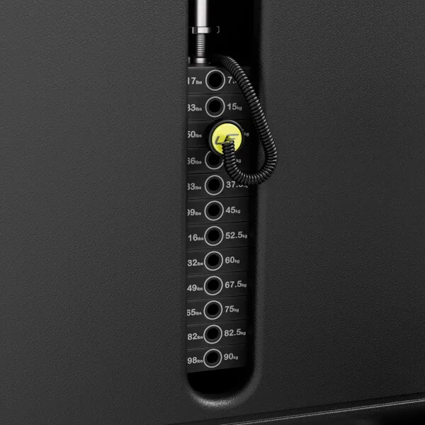 Závaží stroje tvoří 90 kg sada cihel, které jsou opatřeny štítkem s celkovou hmotností v kilogramech a librách. Volič zátěže je vyroben z hliníku a proti ztrátě je připevněn na lanku zkrouceném do spirály. Na krytu závaží je umístěna cedulka s názvem stroje, piktogramem, které svaly lze na daném stroji procvičovat a ilustrace, jak se daný stroj užívá.
