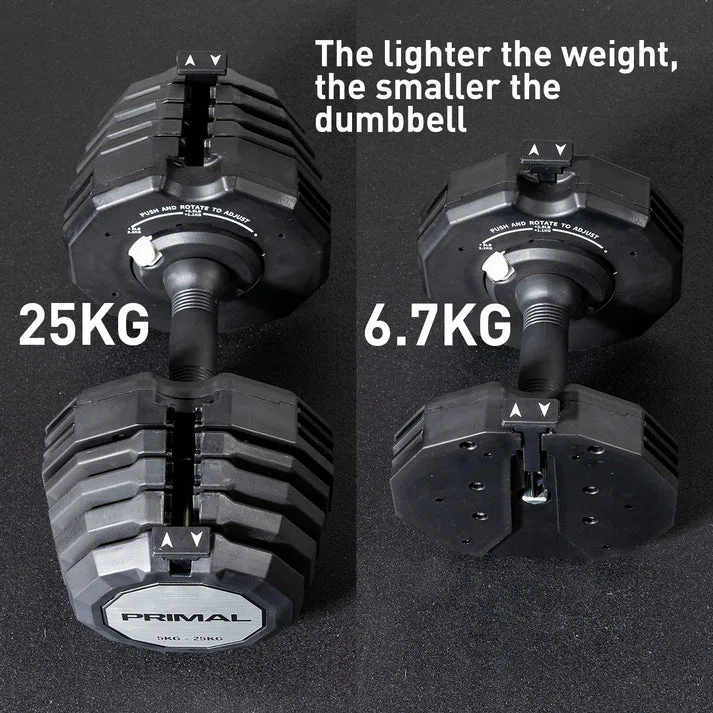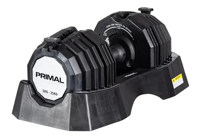 Jednoruční nakládací činka PRIMAL STRENGTH s praktickým řešením úpravy zátěže. Pomocí praktického nakládacího/vykládacího systému nebyla změna hmotnosti nikdy snazší. Vámi požadovanou váhu si můžete velmi jednoduše změnit pomocí posuvníku, kterým vyberete požadovanou hmotnost. K dalšímu přesnějšímu zvýšení, nebo snížení váhy slouží otočný mechanismus.