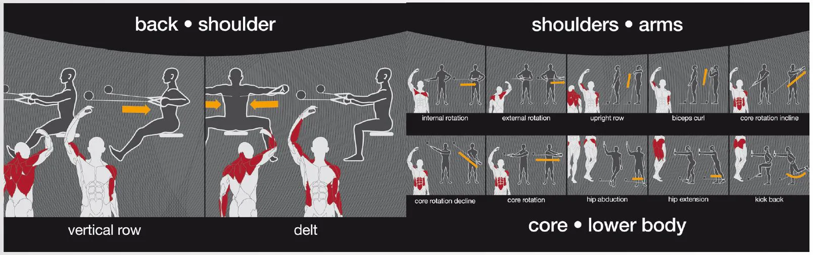 BH FITNESS L480 umožňuje procvičení desítek cviků na celé tělo např. stahování horní kladky, cviky na ramena, zanožování, veslování, cviky na břišní svalstvo apod..