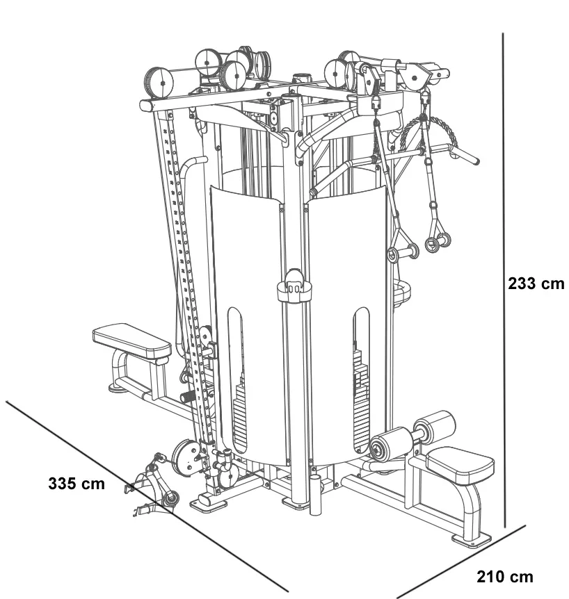Díky samostatným pozicím mohou tento multifunkční stroj obsluhovat 4 cvičenci současně a každý si může navolil libovolnou hmotnost nezávisle na sobě.Hlavní předností této konstrukce je universálnost využití a kvalitní, masivní provedení konstrukce z profilů s tloušťkou materiálu 4 mm a práškovou povrchovou úpravou. Stroj nabízí profesionální, otočné kladky na ložiscích na 4 stanovištích.