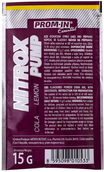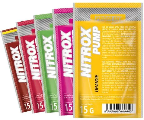 Složení: kreatin monohydrát, L-arginin, beta alanin, citrulin malát, taurin, kyselina citronová, extrakt zeleného čaje, kofein, náhradní sladidla: sukralóza a neohesperidin E 959, niacin, pro malinovou příchuť: aroma malina, barvivo koncentrát červené řepy; pro pomerančovou příchuť: aroma pomerančové, barvivo beta karoten