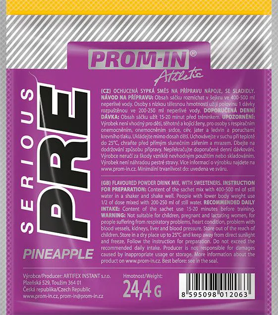 Prom-IN Serious Pre je předtréninkový doplněk stravy vhodný pro sportovce při zvýšené fyzické zátěži. Produkt představuje jedinečnou kombinaci ingrediencí a stimulačních látek podporujících zvýšení výkonnosti, napumpování a soustředěnost během vašeho tréninku. Vybírejte z několika ovocných příchutí bez kofeinu. Našlapaný předtréninkový přípravek zaměřený na maximální trénink bez nadměrné stimulace, nekompromisní složení, účinné složky v opravdu účinném množství