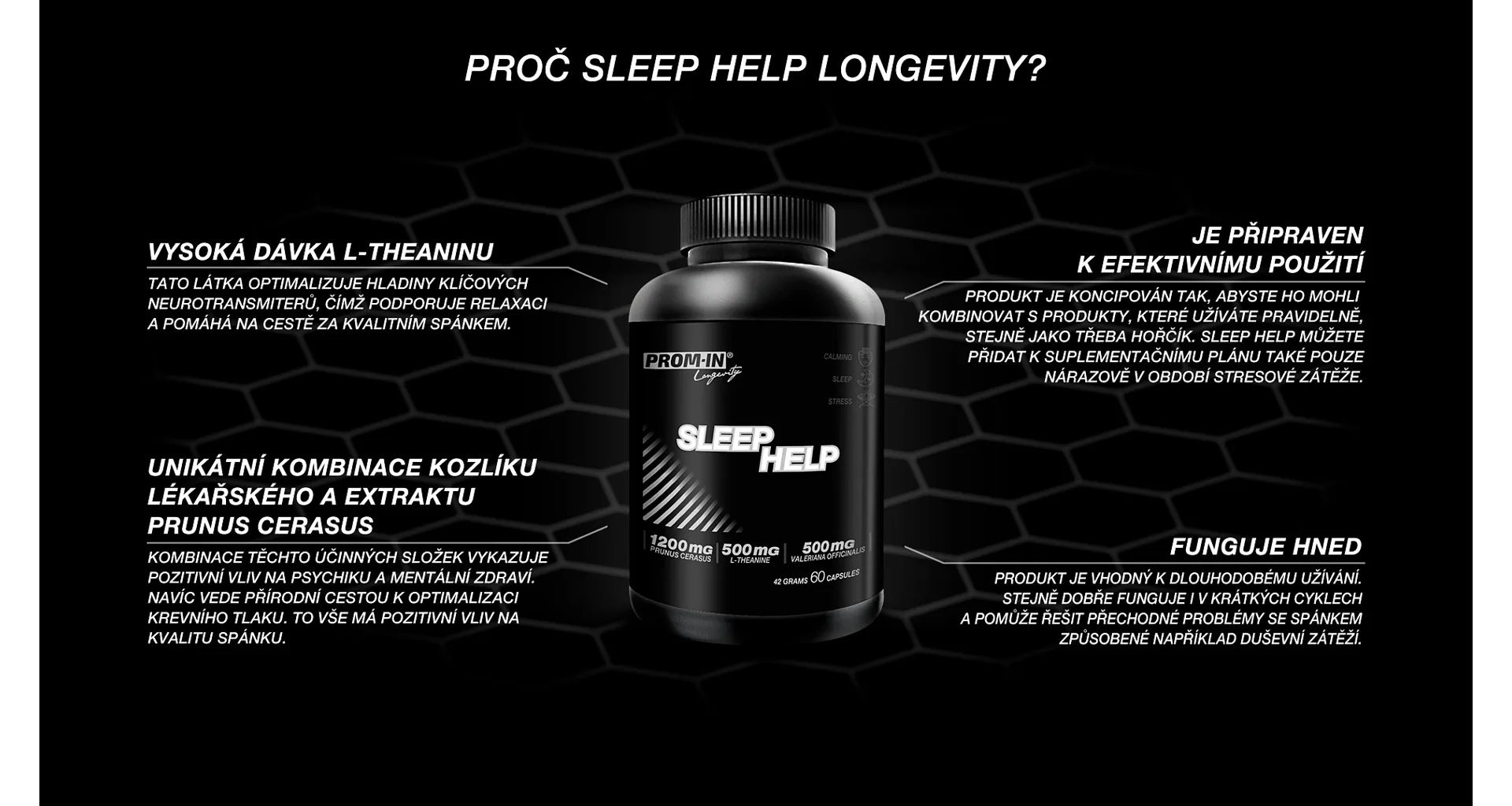 PROM-IN Sleep Help je unikátní produkt kombinující účinné složky zajišťující optimální podporou klíčových neurotransmiterů a tím zajistit kvalitní a hluboký spánek.