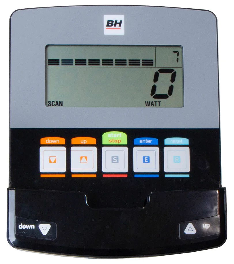 Recumbent BH Fitness Artic Comfort Program je vybaven přehledným počítačem s držákem na tablet/smartphone, senzory pro měření tepové frekvence, vyrovnávači nerovnosti, transportními kolečky a držákem na lahev.