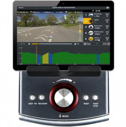 Trenažér Hammer Comfort Motion BT má integrovaný USB port pro nabíjení, držák na tablet a bluetooth připojení pro tréninkové aplikace.