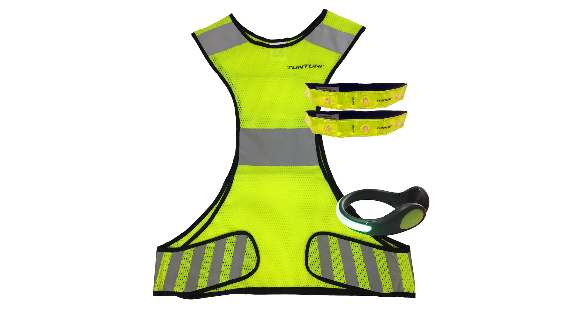 Reflexní sada pro běh Tunturi poskytuje extrémně dobrou viditelnost ve tmě. Sada může být použita pro všechny druhy outdoorových aktivit jako: chůze, běh, cyklistika, jízda na koni atd. Sada se skládá z 1 X-Shape Reflexní vesty, 2 LED pásků a 1 LED klipu na boty.