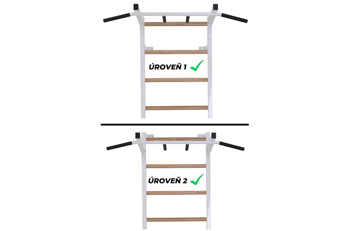 Komplet TRINFIT Elegance vyniká propracovaným designem, který přináší výhodu, jakou u konkurenčních produktů často nenajdete. Ve vrchní části ribstole jsou tři otvory – jeden pro bezpečné uchycení ribstole do zdi a dva pro snadnou montáž hrazdy TRINFIT Elegance. Díky tomu si můžete nastavit výšku hrazdy do dvou úrovní - 1. Úroveň ve výšce 228 cm a 2. úroveň pak ve výšce 215 cm. To zaručuje pohodlné cvičení pro uživatele různých výšek. Tento systém nabízí výraznou flexibilitu a přizpůsobení, které standardní ribstole s hrazdami často postrádají, a umožňuje každému dosáhnout optimální ergonomie a efektivity při tréninku.