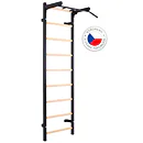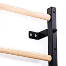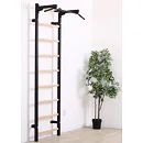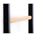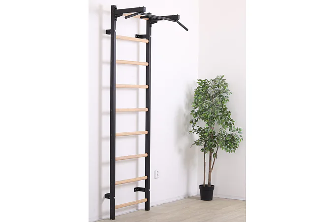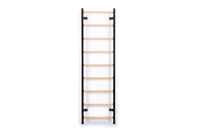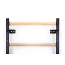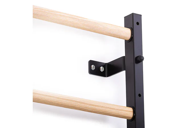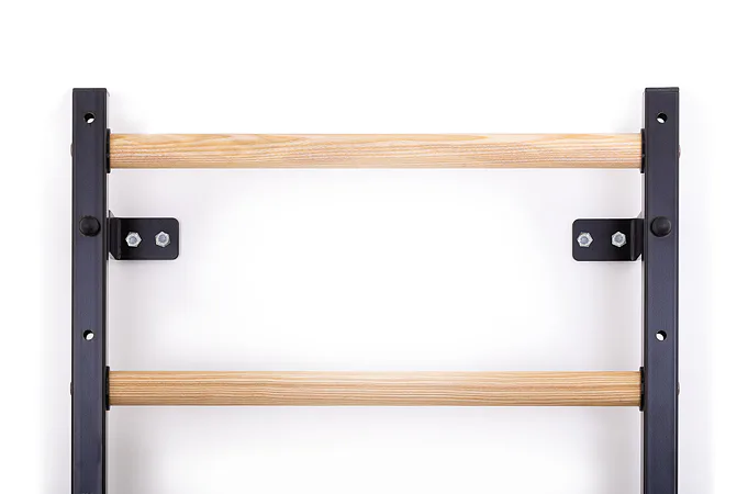 Součástí balení je kompletní upevňovací materiál do zdi – 4 horizontální úhelníky o tloušťce 5 mm, lakované vypalovanou barvou a sada vratových šroubů do ribstole. Stabilní a designově zdařilé uchycení žebřiny do zdi lakovaným úhelníkem skrz bočnici ribstole. Levnější ribstole naproti tomu většinou drží jen plechové úchyty na samořezy.