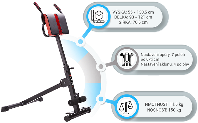 Římská lavice, neboli hyperextenze HMS LR8310, slouží k intenzivnímu posilování zádového a hýžďového svalstva. Pro správnost polohy při cvičení je opěra výškově nastavitelná v rozmezí 93 - 121 cm. Pro regulaci zátěže je lavice nastavitelná do čtyř úhlů. Cvičením na této lavici předcházíte mimo jiné bolestem zad, které jsou způsobené ochablým svalstvem bederní páteře.