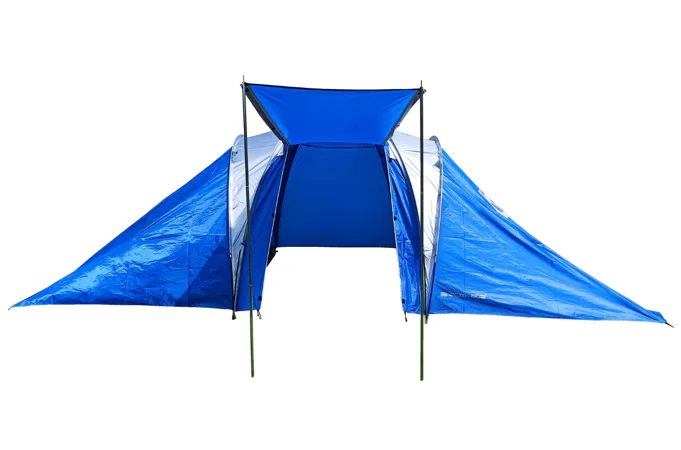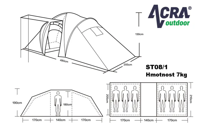 Velký rodinný stan BROTHER ST08 až pro 6 osob, 2 ložnice + předsíňka . Vhodný pro příležitostné kempování nabízí dostatek prostoru pro větší rodinu. Předsíňka spolu se slunečním přístřeškem vytvářejí dostatek vnitřního prostoru i v případě nepříznivého počasí. I při své velikosti je velmi skladný s pomocí laminátových prutů. Podlepené švy zabraňují průniku vody dovnitř stanu při dešti. Stan má závěsnou ložnici a vrchní plášť přetažený přes laminátové nosné pruty.