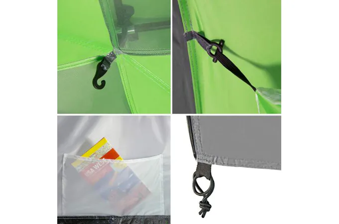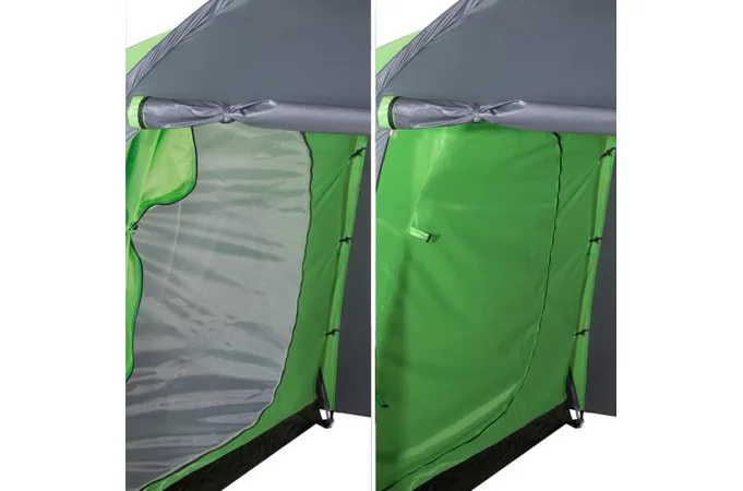 Do stanu se vstupuje přes předsíňku z obou stran. Vchod se otevírá pomocí dvou samostatných zipů a otevřený panel lze buď srolovat a zajistit poutky a nebo jej pomocí dodávaných prutů použít jako stříšku. Vchod do ložnice je vybaven jak plachtou, tak moskytiérou. Vnitřní stan dále disponuje horním a zadním větracím otvorem, které jsou také opatřeny moskytiérami, ve středu horního otvoru je navíc poutko pro zavěšení svítilny. Po stranách ložnice se nachází 2 kapsy pro odložení telefonu, peněženky apod..