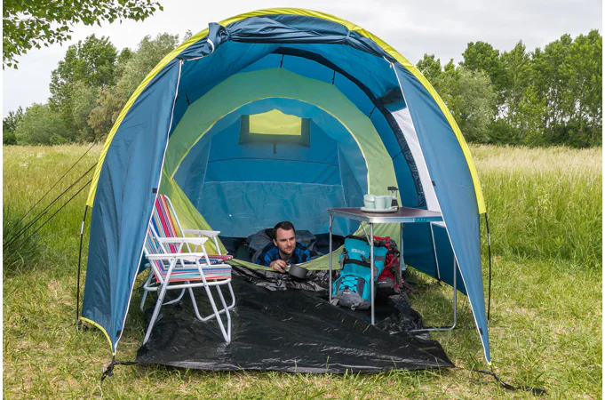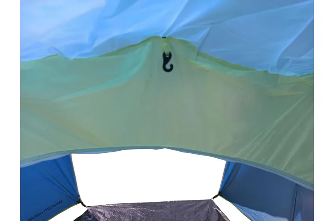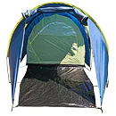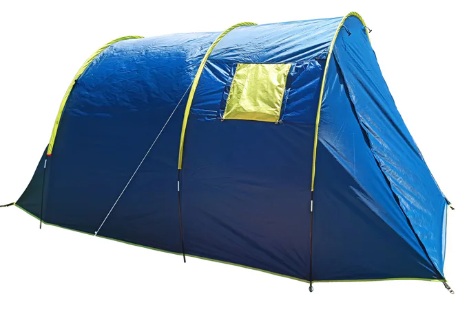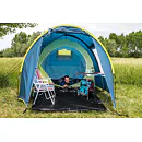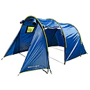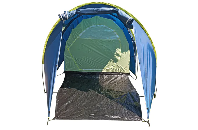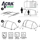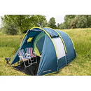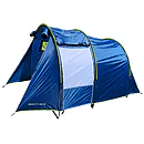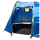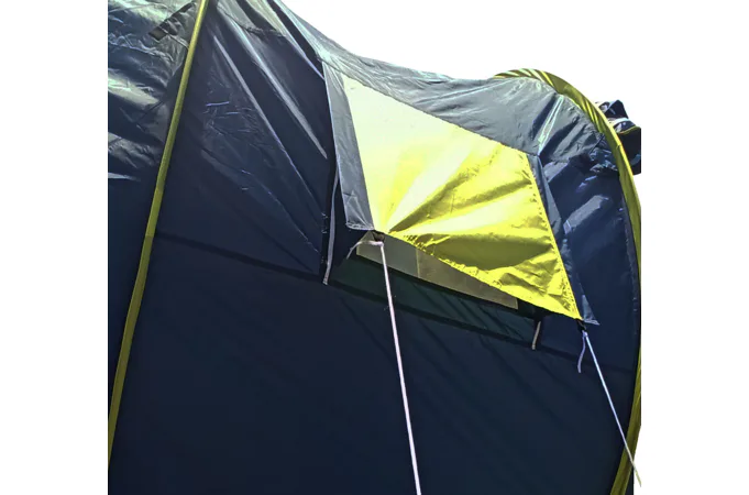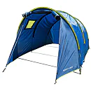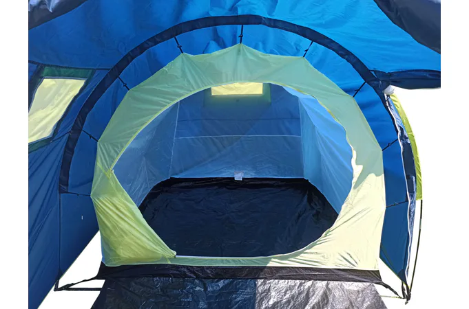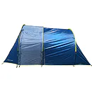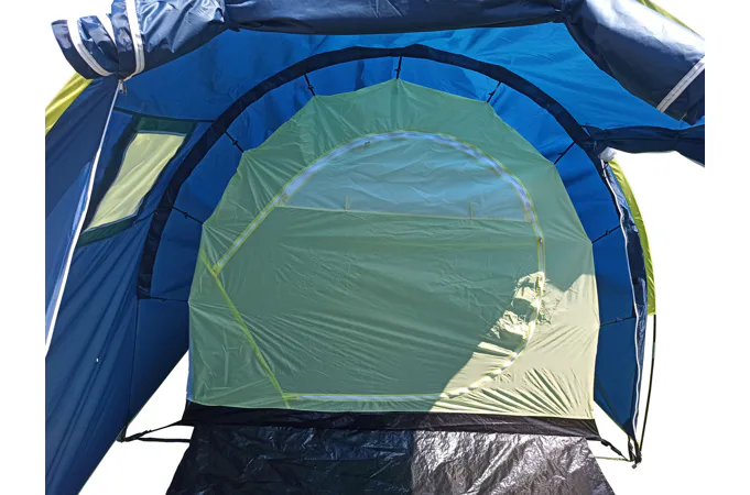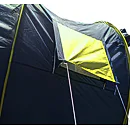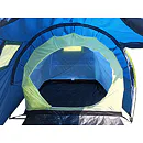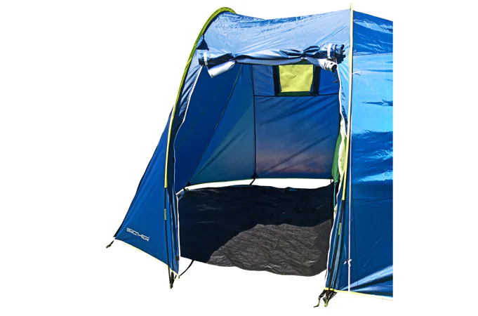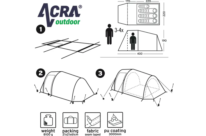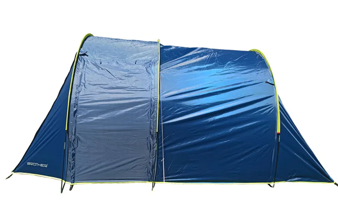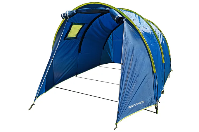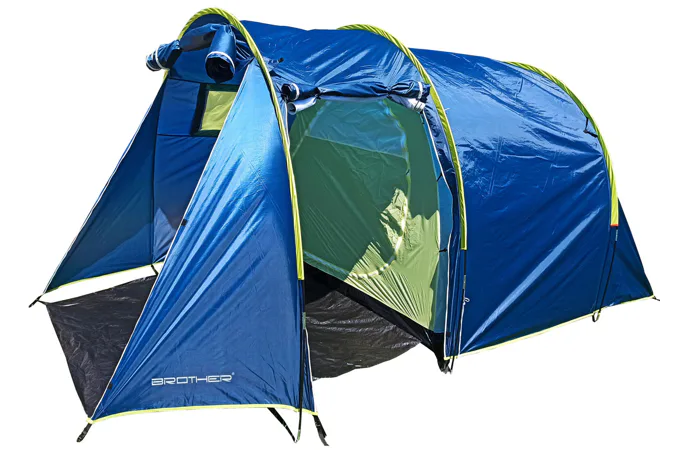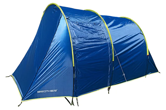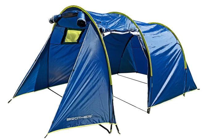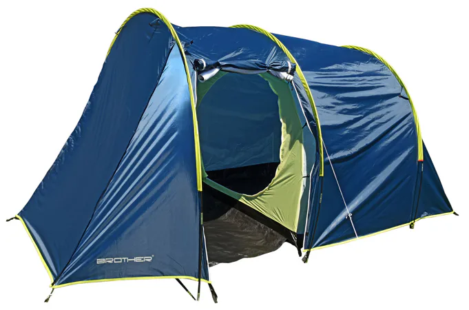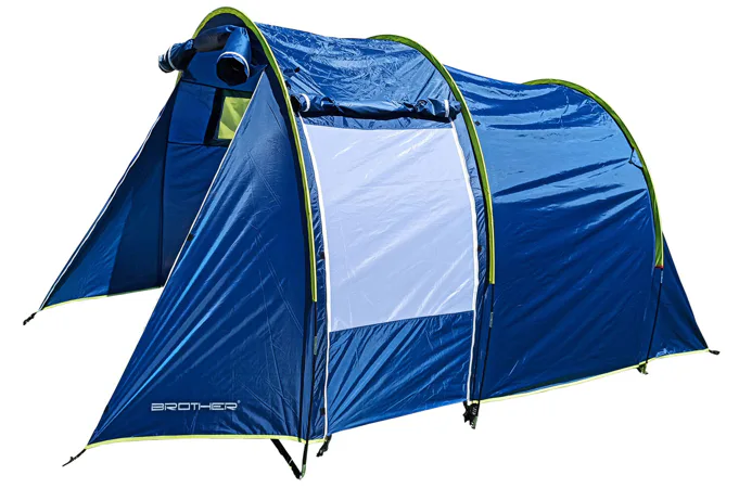 Rodinný stan BROTHER ST18 pro 4 osoby ve tvaru tunelu o rozměru 400 cm (délka včetně předsíňky) x 220 cm (šířka stanu) x 190 cm (výška stanu v předsíňce), jedna velká ložnice o rozměru 220 x 220 cm, shrnovací přístřešek z přední strany stanu, podlážka v předsíňce o rozměrech 180 cm délka x 220 cm šířka.